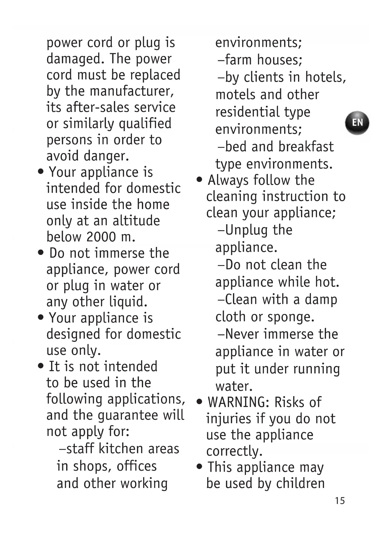 - Always follow the cleaning instruction to clean your appliance; – Unplug the appliance. – Do not clean the appliance while hot. – Clean with a damp cloth or sponge. – Never immerse the appliance in water or put it under running water.