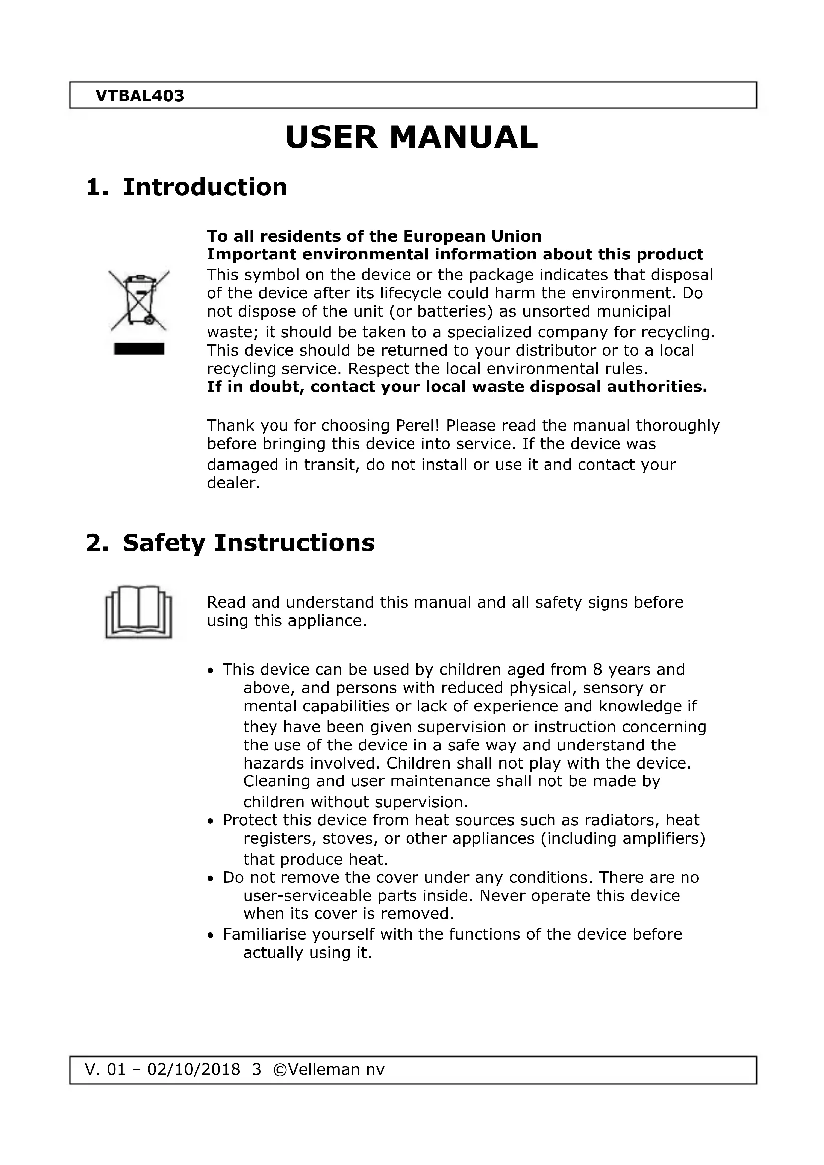 The copyright to this manual is owned by Velleman nv. All worldwide rights reserved. No part of this manual may be copied, reproduced, translated or reduced to any electronic medium or otherwise without the prior written consent of the copyright holder.VTBAL403