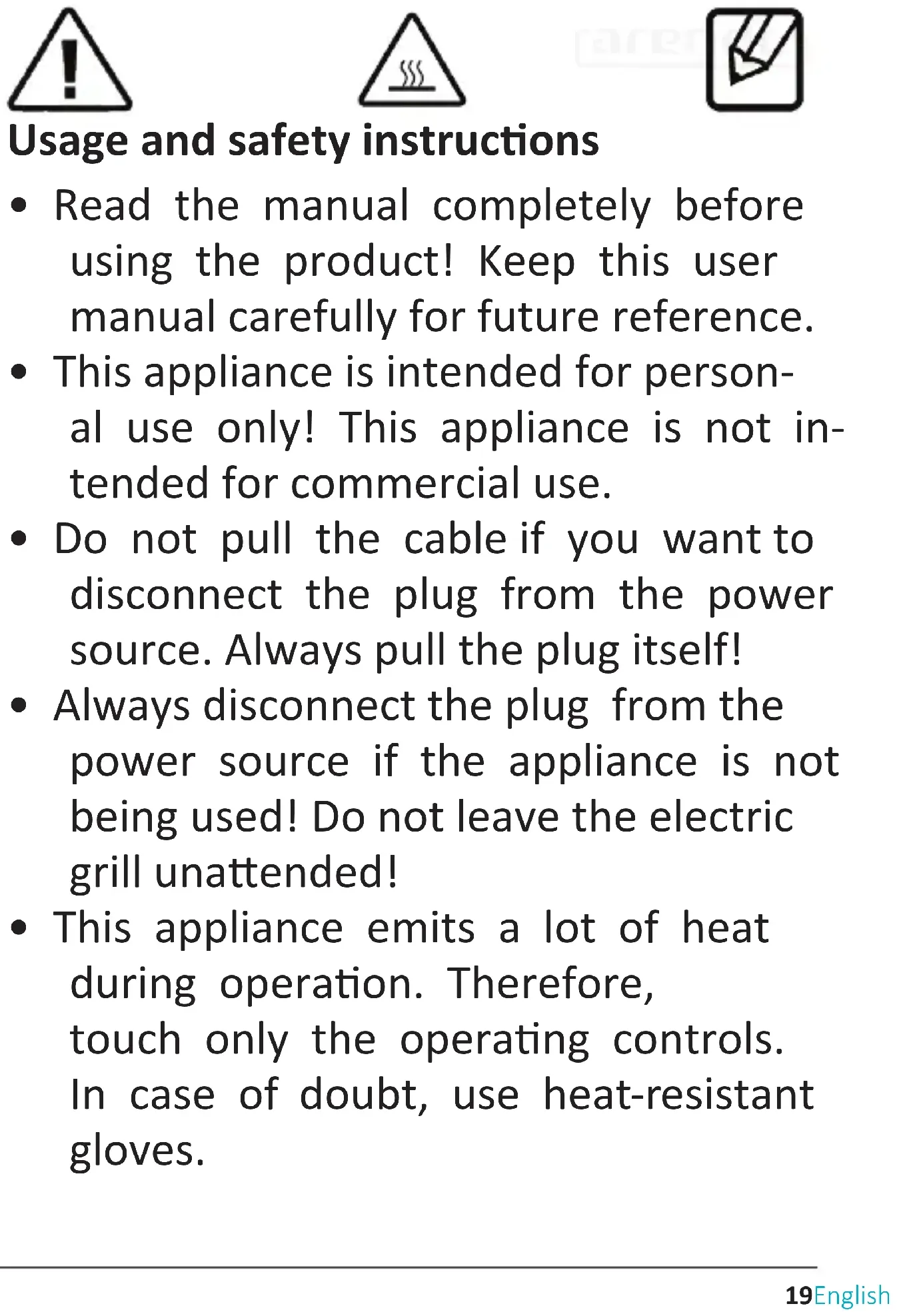 - CAUTION! Hot surface!26 English Thank you for choosing an Arendo product. Please read the following user manu- al carefully so that you can enjoy the purchased product for a long me.