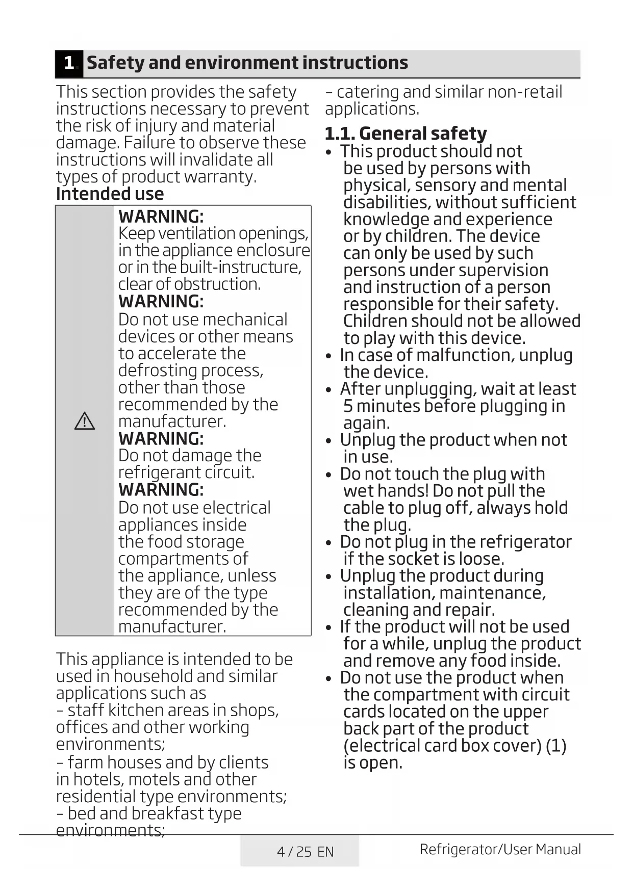 Do not use electrical appliances inside the food storage compartments of the appliance, unless they are of the type recommended by the manufacturer. This appliance is intended to be used in household and similar applications such as – staff kitchen areas in shops, offices and other working environments; – farm houses and by clients in hotels, motels and other residential type environments; – bed and breakfast type environments;5 / 25 EN Refrigerator/User Manual Safety and environment instructions
