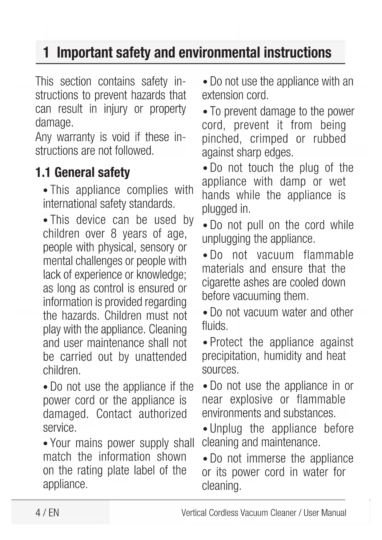 - Do not immerse the appliance or its power cord in water for cleaning. 1 Important safety and environmental instructionsVertical Cordless Vacuum Cleaner / User Manual 5 / EN