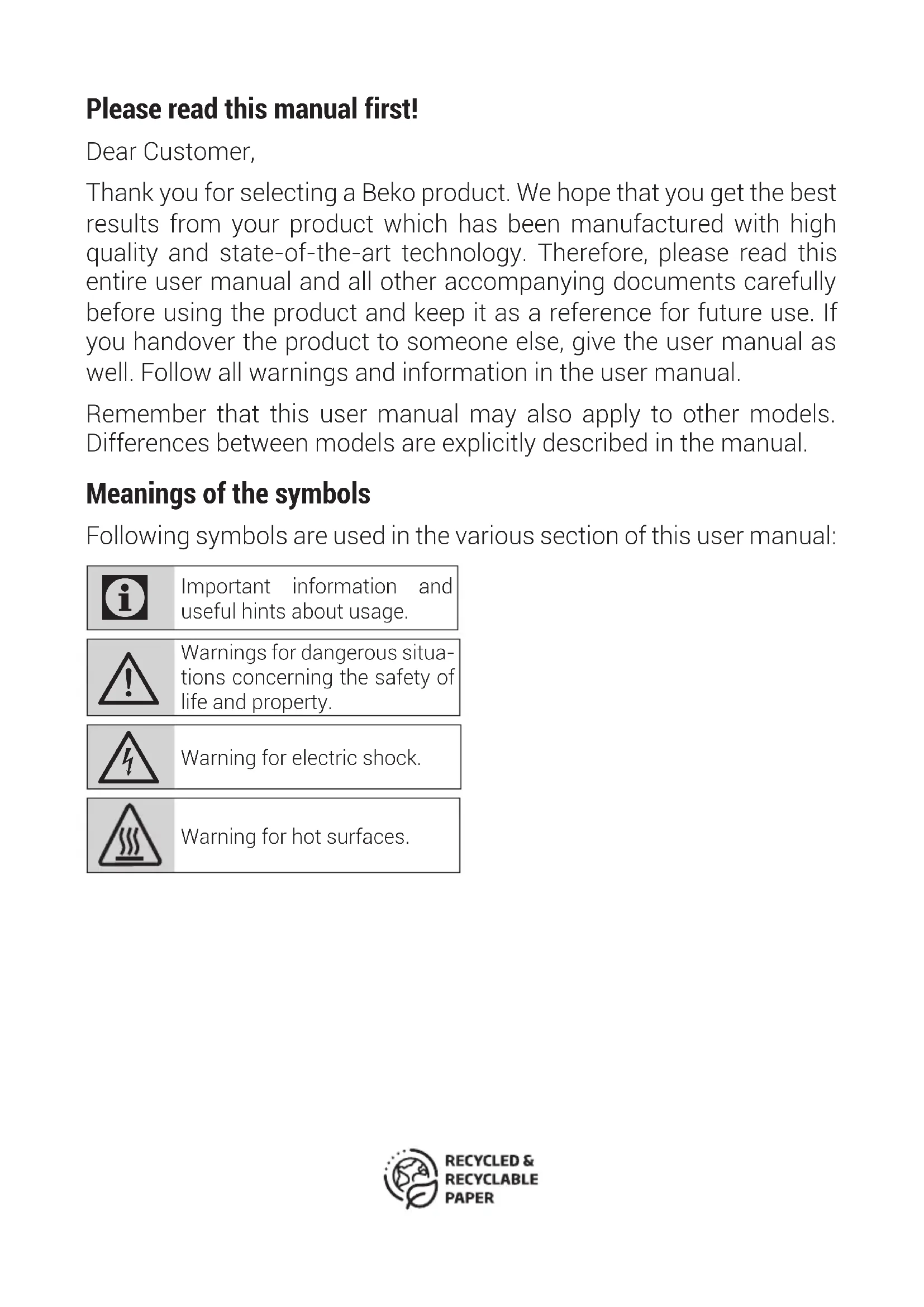 EN - FR - AR 01M-9210353200-0824-03 01M-9210693200-0824-03 User Manual Microwave OvenMicrowave Oven / User Manual 2 / EN CONTENTS ENGLISH 3-20 FRANÇAIS 21-41Please read this manual first! Dear Customer, Thank you for selecting a Beko product. We hope that you get the best results from your product which has been manufactured with high quality and state-of-the-art technology. Therefore, please read this entire user manual and all other accompanying documents carefully before using the product and keep it as a reference for future use. If you handover the product to someone else, give the user manual as well. Follow all warnings and information in the user manual. Remember that this user manual may also apply to other models. Differences between models are explicitly described in the manual. Meanings of the symbols Following symbols are used in the various section of this user manual:
