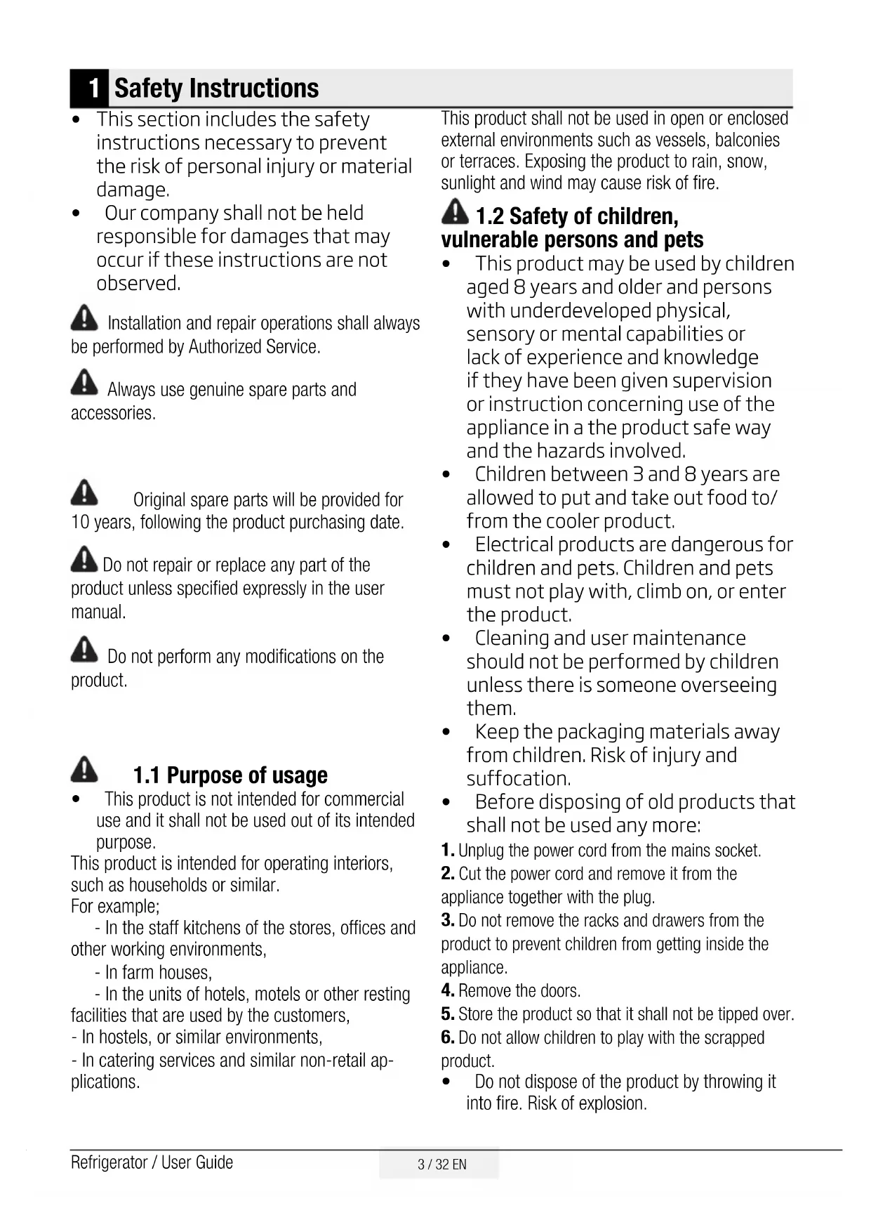 7 Maintenance and cleaning 31 8 Troubleshooting 323 / 32 EN Refrigerator / User Guide 1 Safety Instructions t This section includes the safety instructions necessary to prevent the risk of personal injury or material damage. t Our company shall not be held responsible for damages that may occur if these instructions are not observed. Installation and repair operations shall always be performed by Authorized Service. Always use genuine spare parts and accessories. Original spare parts will be provided for 10 years, following the product purchasing date. Do not repair or replace any part of the product unless specified expressly in the user manual. Do not perform any modifications on the product.
