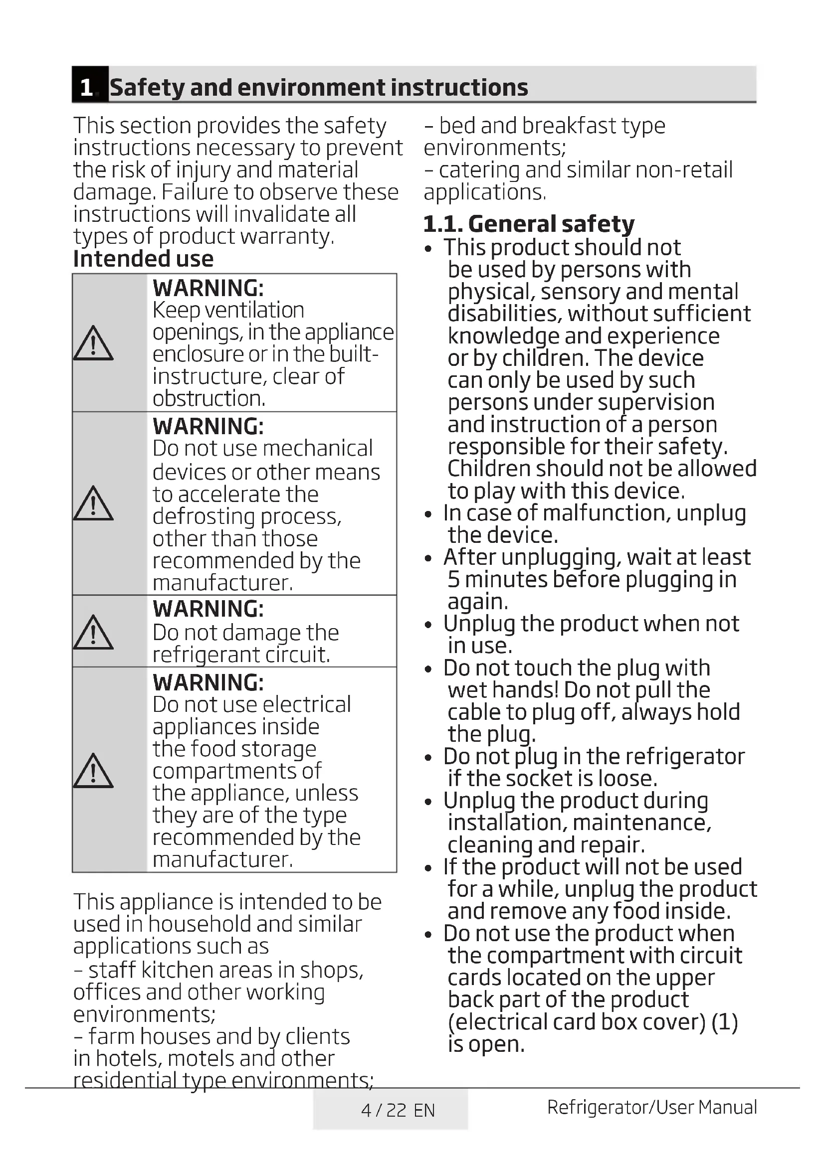 - Do not use the product when the compartment with circuit cards located on the upper back part of the product (electrical card box cover) (1) is open.5 / 22 EN Refrigerator/User Manual Safety and environment instructions