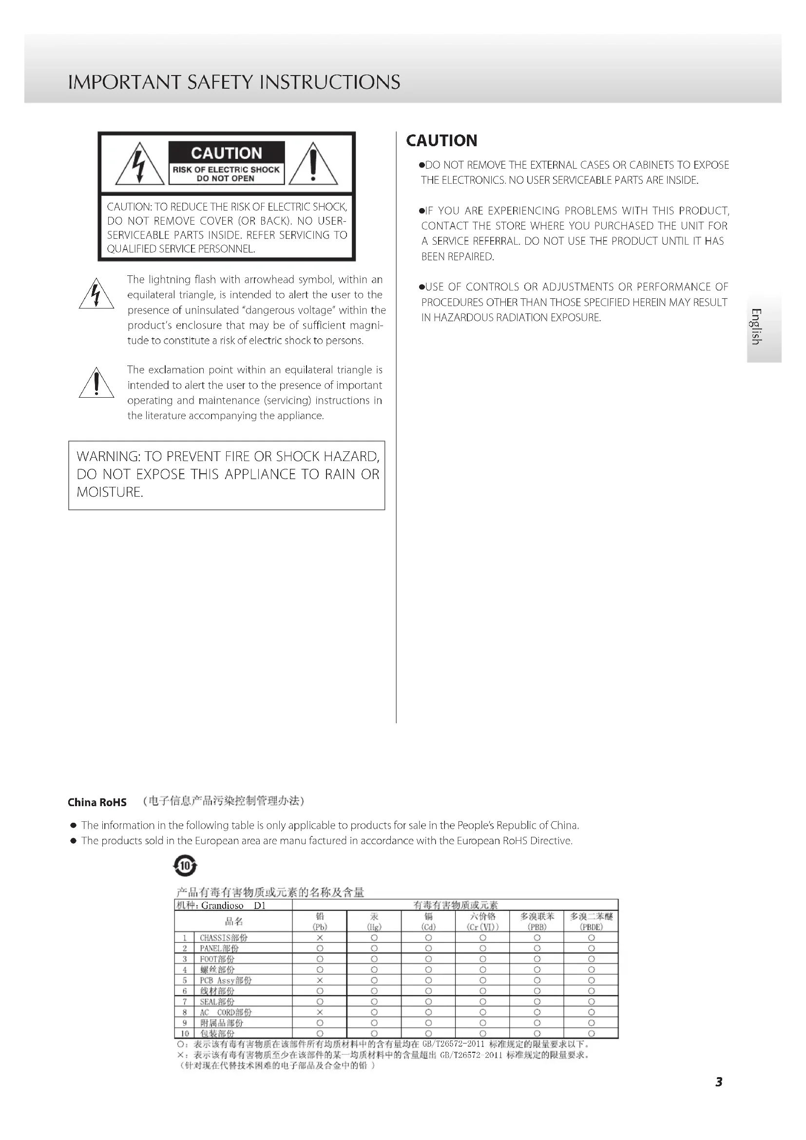 DO NOT EXPOSE THIS APPLIANCE TO RAIN OR MOISTURE. CAUTION o DO NOT REMOVE THE EXTERNAL CASES OR CABINETS TO EXPOSE THE ELECTRONICS. NO USER SERVICEABLE PARTS ARE INSIDE. o IF YOU ARE EXPERIENCING PROBLEMS WITH THIS PRODUCT, CONTACT THE STORE WHERE YOU PURCHASED THE UNIT FOR A SERVICE REFERRAL. DO NOT USE THE PRODUCT UNTIL IT HAS BEEN REPAIRED. o USE OF CONTROLS OR ADJUSTMENTS OR PERFORMANCE OF PROCEDURES OTHER THAN THOSE SPECIFIED HEREIN MAY RESULT IN HAZARDOUS RADIATION EXPOSURE.China RoHS o The information in the following table is only applicable to products for sale in the People’s Republic of China. o The products sold in the European area are manu factured in accordance with the European RoHS Directive. *%7*UDQGLRVR '*%744