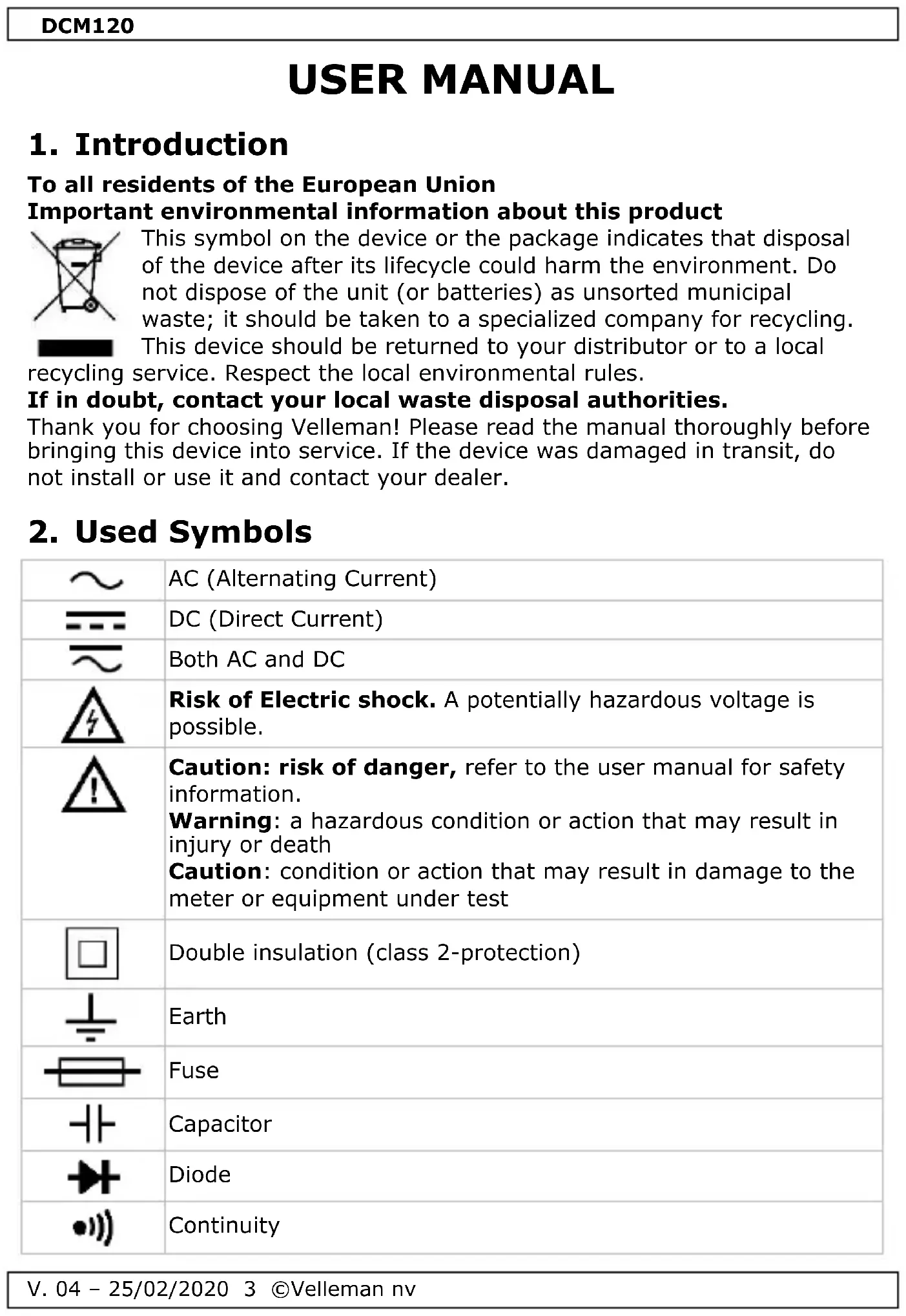 Download the instructions for your Measuring equipment in PDF format for free! Find your manual DCM120 - VELLEMAN and take your electronic device back in hand. On this page are published all the documents necessary for the use of your device. DCM120 by VELLEMAN.