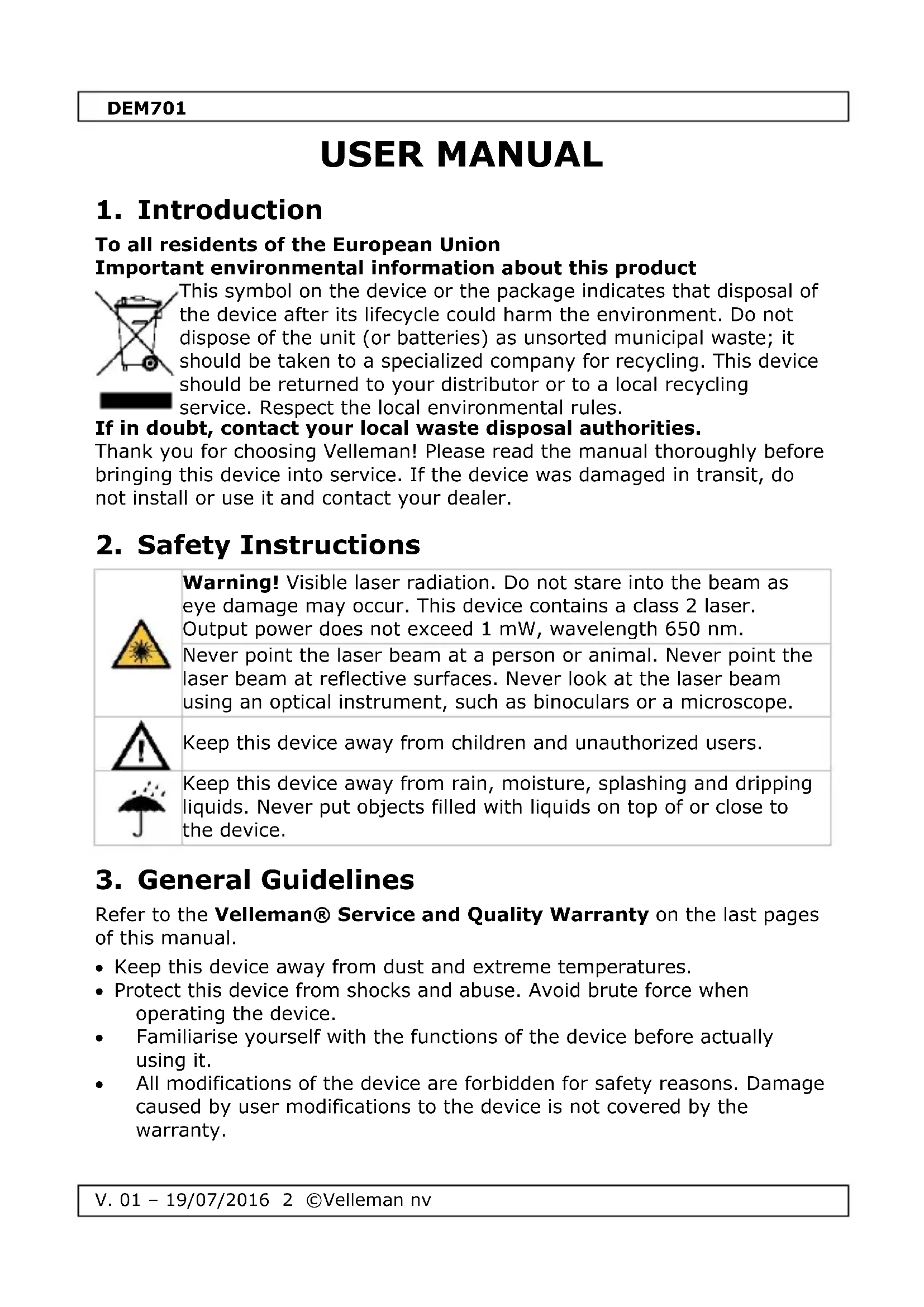range ............................................. 0.05-30 m (0.16-98.4 ft) accuracy ................................................ ± 2.0 mm (± 0.08") laser ............................................................ <1 mW, class 2 wavelength .............................................................. 650 nm operating temperature ............................. 0-40 °C (32-104°F) IP rating...................................................................... IP54 power supply .................... 2x 1.5 V AAA batteries LR03C (incl.) dimensions ............................................... 119 x 37 x 26 mm weight (with battery) .................................................... 70 g Use this device with original accessories only. Velleman nv cannot be held responsible in the event of damage or injury resulting from (incorrect) use of this device. For more info concerning this product and the latest version of this manual, please visit our website www.velleman.eu. The information in this manual is subject to change without prior notice. © COPYRIGHT NOTICE The copyright to this manual is owned by Velleman nv. All worldwide rights reserved. No part of this manual may be copied, reproduced, translated or reduced to any electronic medium or otherwise without the prior written consent of the copyright holder.DEM701