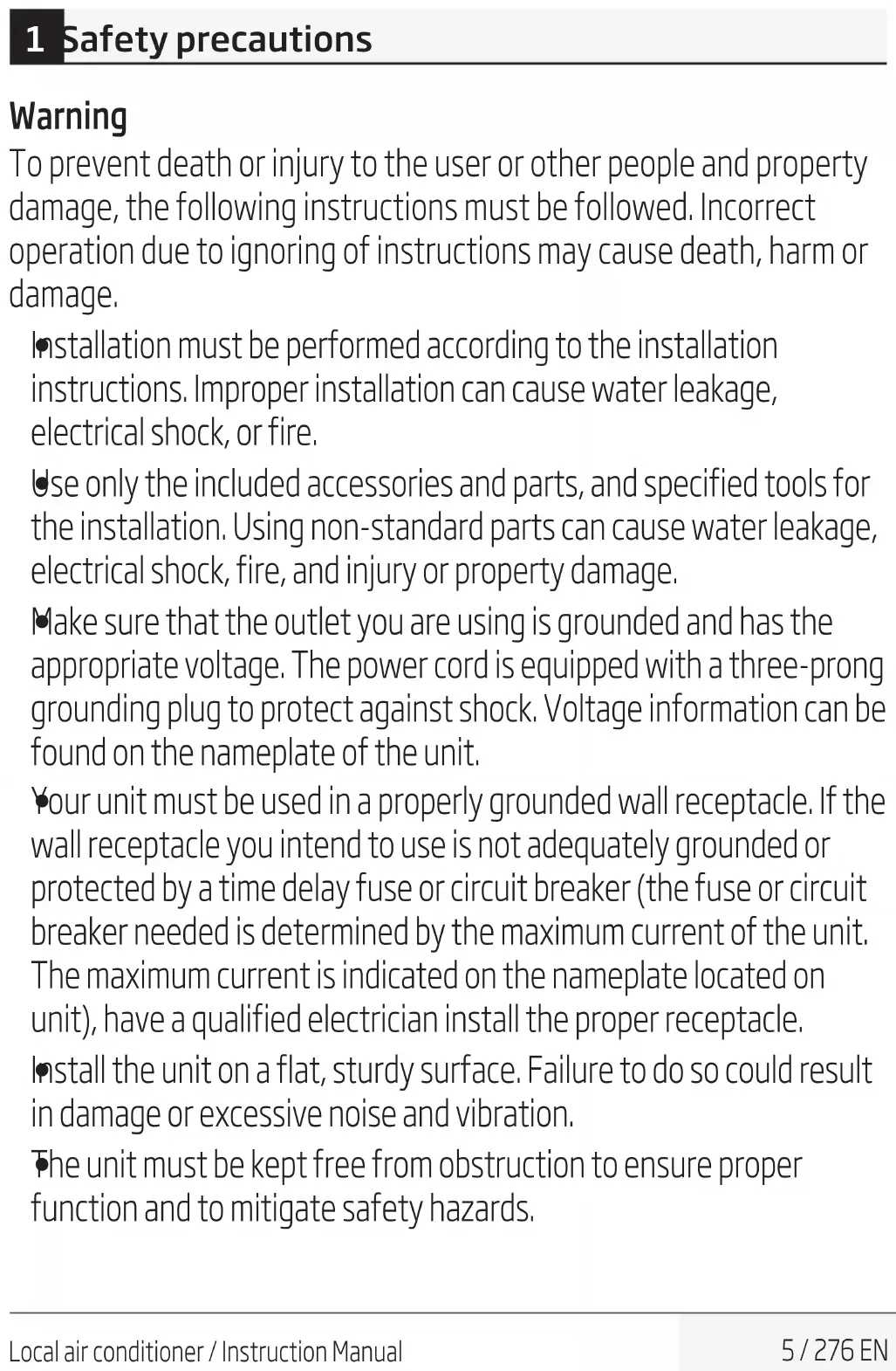 The unit must be kept free from obstruction to ensure proper function and to mitigate safety hazards.6 / 276 EN Local air conditioner / Instruction Manual 1 Safety precautions