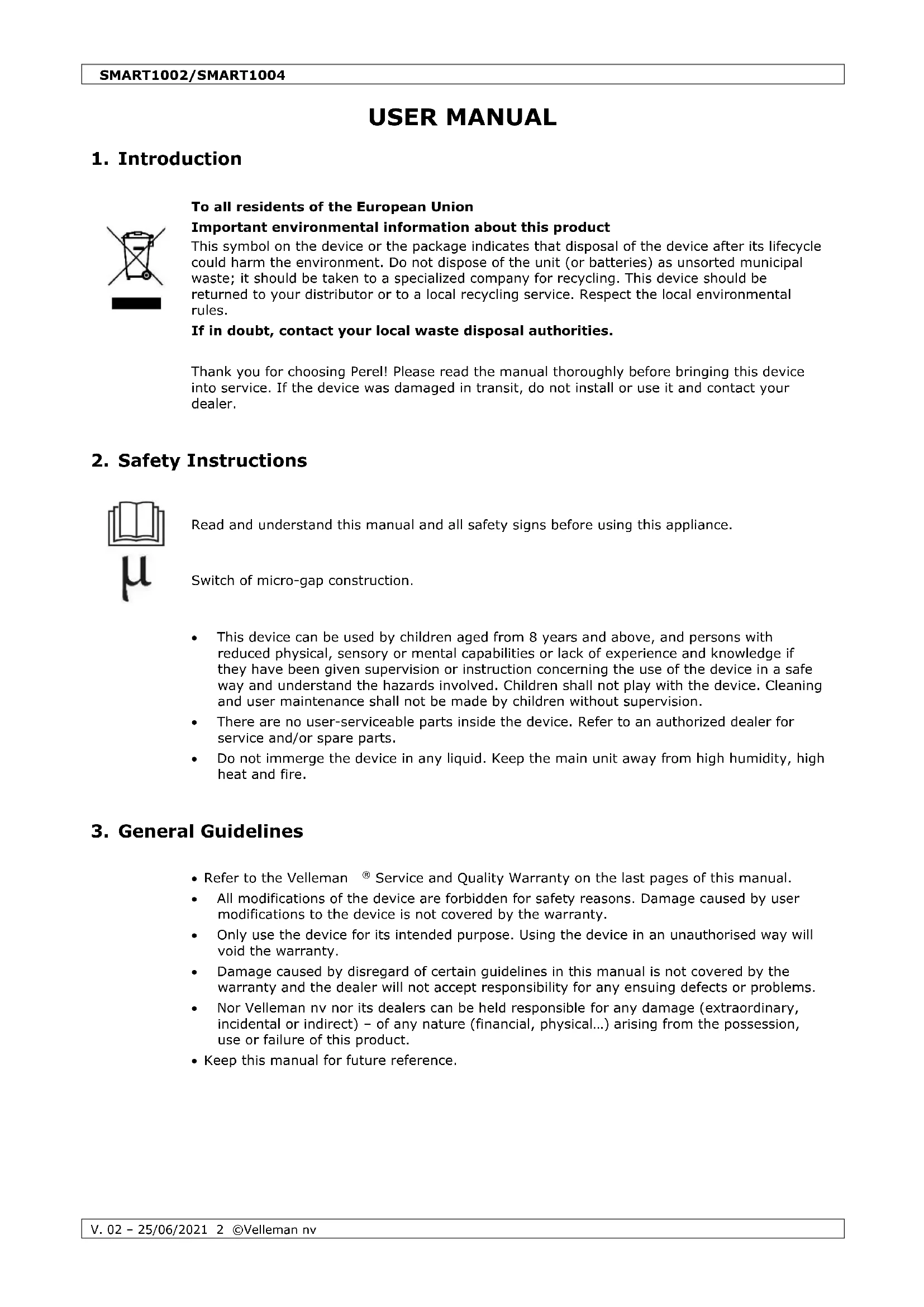 © COPYRIGHT NOTICE The copyright to this manual is owned by Velleman nv. All worldwide rights reserved. No part of this manual may be copied, reproduced, translated or reduced to any electronic medium or otherwise without the prior written consent of the copyright holder.SMART1002/SMART1004