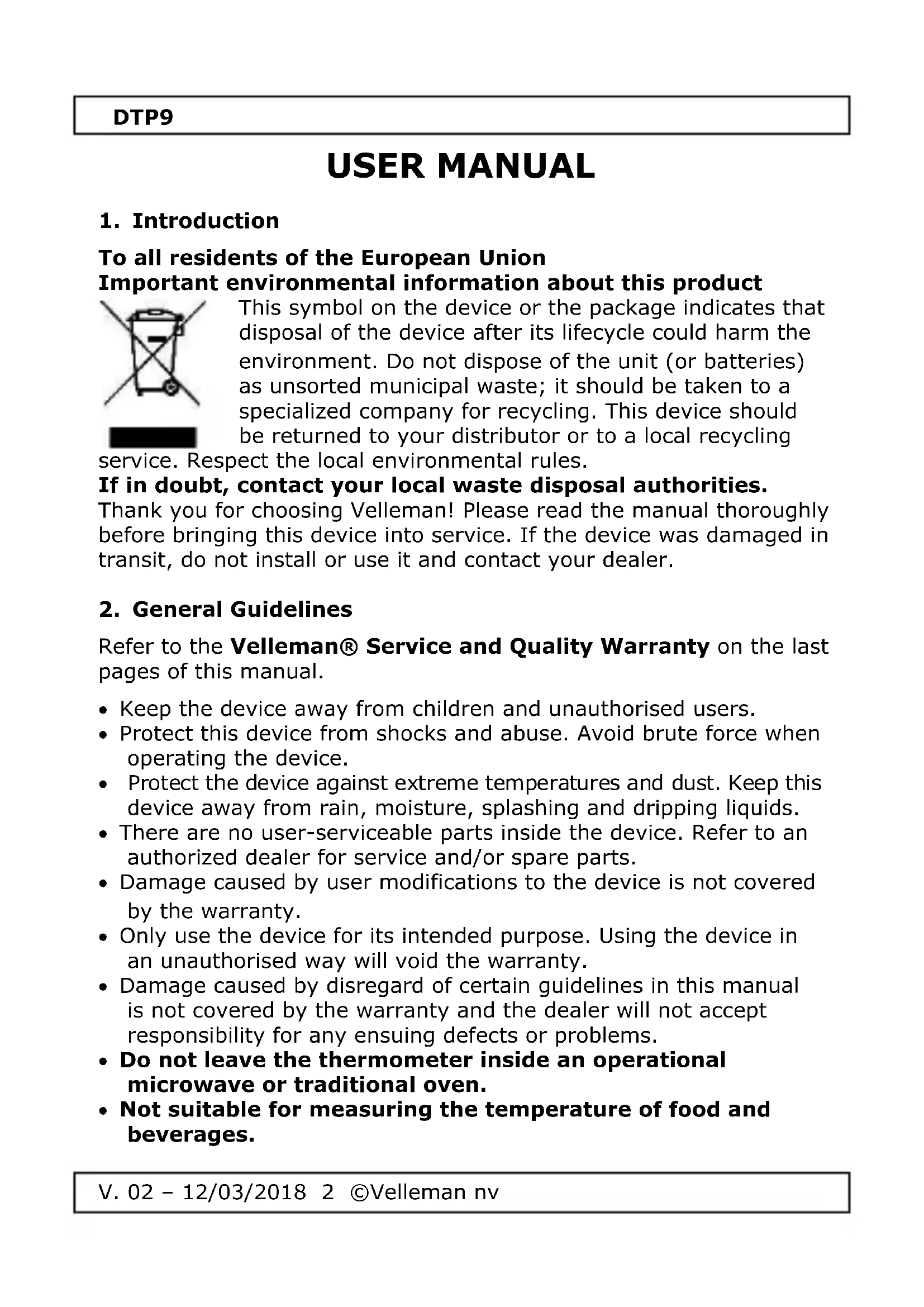 Refer to the Velleman® Service and Quality Warranty on the last pages of this manual. Keep the device away from children and unauthorised users. Protect this device from shocks and abuse. Avoid brute force when operating the device. Protect the device against extreme temperatures and dust. Keep this device away from rain, moisture, splashing and dripping liquids. There are no user-serviceable parts inside the device. Refer to an authorized dealer for service and/or spare parts. Damage caused by user modifications to the device is not covered by the warranty. Only use the device for its intended purpose. Using the device in an unauthorised way will void the warranty. Damage caused by disregard of certain guidelines in this manual is not covered by the warranty and the dealer will not accept responsibility for any ensuing defects or problems. Do not leave the thermometer inside an operational microwave or traditional oven. Not suitable for measuring the temperature of food and beverages.DTP9