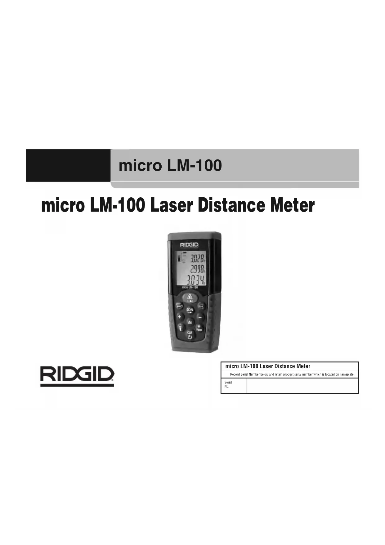 Download the instructions for your Measuring equipment in PDF format for free! Find your manual Micro LM100 - RIDGID and take your electronic device back in hand. On this page are published all the documents necessary for the use of your device. Micro LM100 by RIDGID.
