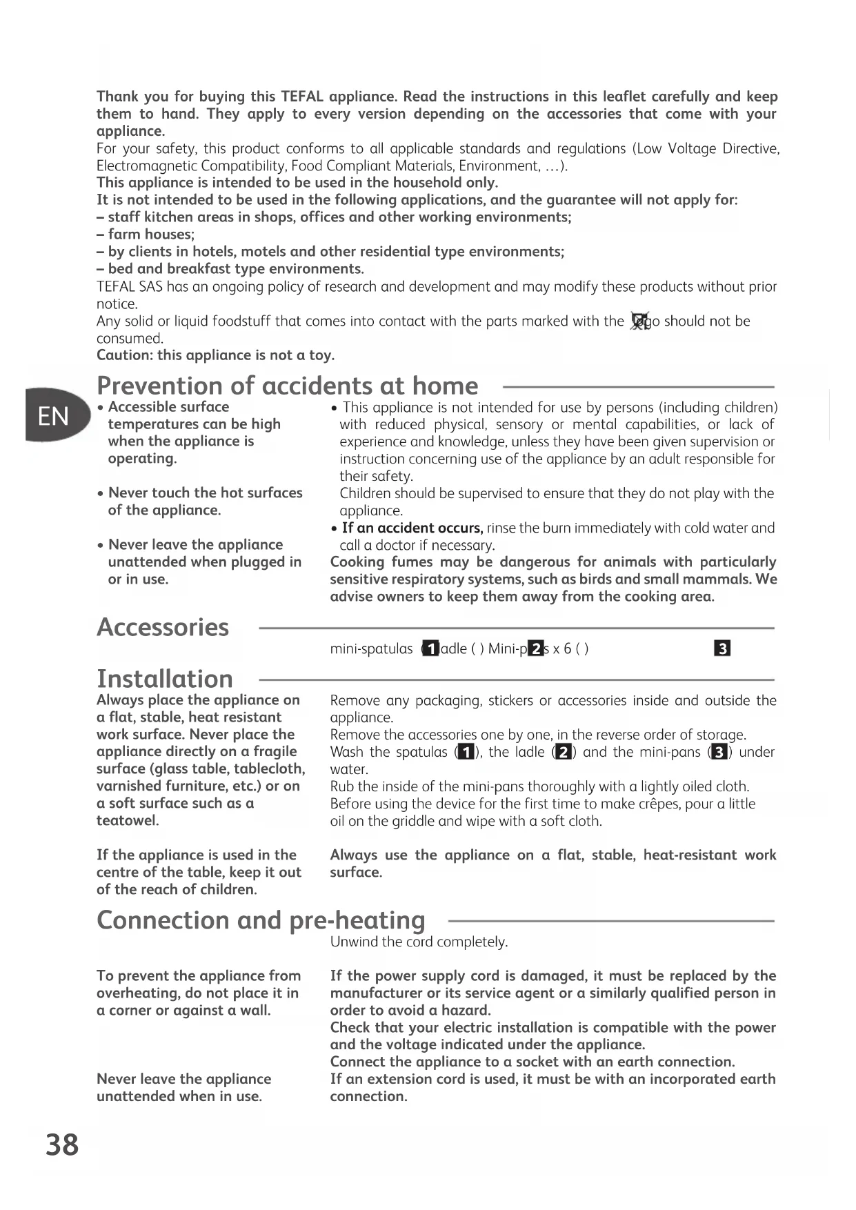 - If an accident occurs, rinse the burn immediately with cold water and call a doctor if necessary. Cooking fumes may be dangerous for animals with particularly sensitive respiratory systems, such as birds and small mammals. We advise owners to keep them away from the cooking area. Accessories mini-spatulas ( ) ladle ( ) Mini-pans x 6 ( ) Installation Remove any packaging, stickers or accessories inside and outside the appliance. Remove the accessories one by one, in the reverse order of storage. Wash the spatulas ( ), the ladle ( ) and the mini-pans ( ) under water. Rub the inside of the mini-pans thoroughly with a lightly oiled cloth. Before using the device for the first time to make crêpes, pour a little oil on the griddle and wipe with a soft cloth. Always use the appliance on a flat, stable, heat-resistant work surface. Connection and pre-heating Unwind the cord completely. If the power supply cord is damaged, it must be replaced by the manufacturer or its service agent or a similarly qualified person in order to avoid a hazard. Check that your electric installation is compatible with the power and the voltage indicated under the appliance. Connect the appliance to a socket with an earth connection. If an extension cord is used, it must be with an incorporated earth connection.