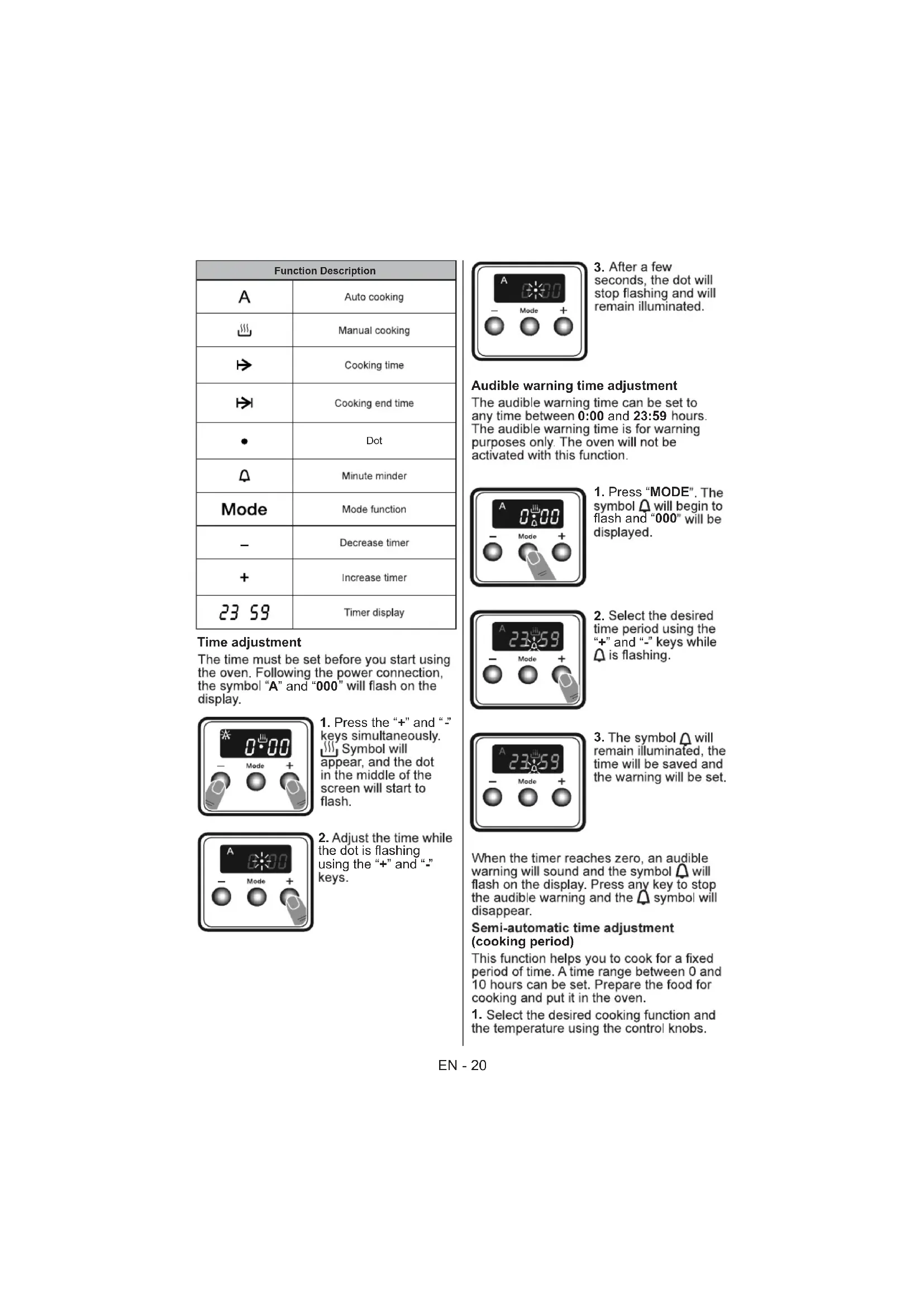 Oven function control knob Oven thermostat knob Oven Functions Oven Lamp: Only the the duration of the Defrost Function: The To use the defrost frozen food in the oven Static Cooking Function: The oven’s Fan Function: The Lower Heating and Fan Function: TheEN - 19 Grilling Function: The grilling and toasting foods on the upper