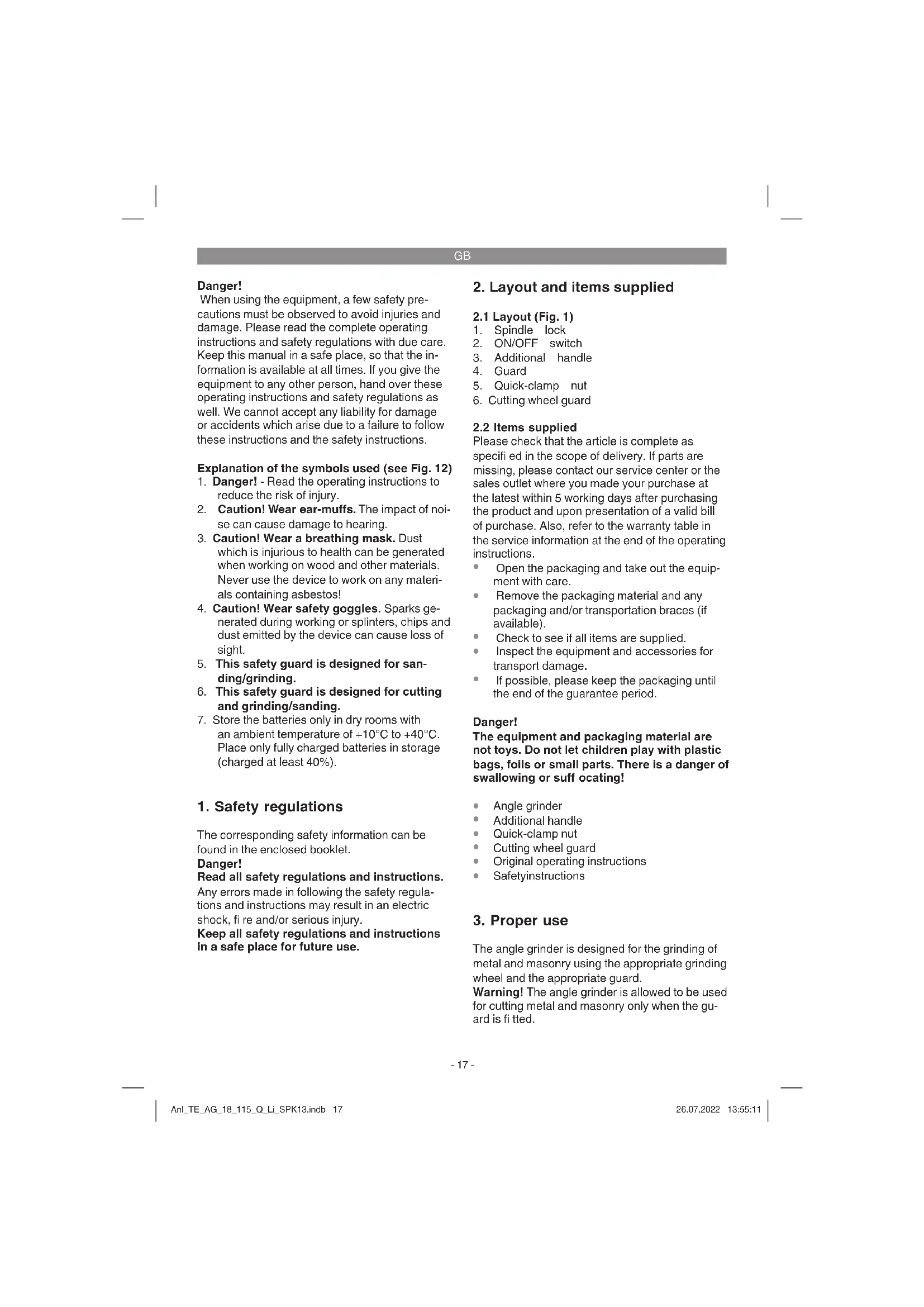 The angle grinder is designed for the grinding of metal and masonry using the appropriate grinding wheel and the appropriate guard. Warning! The angle grinder is allowed to be used for cutting metal and masonry only when the gu- ard is fi tted. Anl_TE_AG_18_115_Q_Li_SPK13.indb 17Anl_TE_AG_18_115_Q_Li_SPK13.indb 17 26.07.2022 13:55:1126.07.2022 13:55:11GB