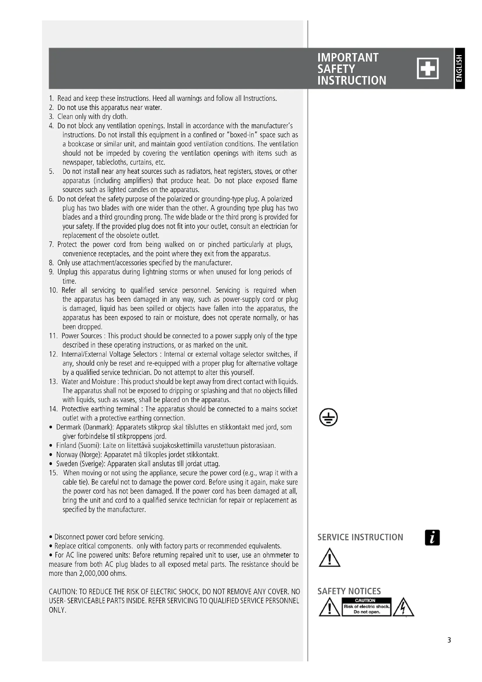 or humidity. OPERATING PRECAUTIONS IMPORTANT NOTES IMPORTANT NOTES WARNING DANGEROUS VOLTAGE: The lightning flash with arrowhead symbol within the equilateral triangle is intended to alert the user to the presence of un-insulated “dangerous voltage” within the product’s enclosure that may be of sufficient magnitude to constitute a risk of electric shock. INSTRUCTIONS: The exclamation point within the equilateral triangle is intended to alert the user to the presence of important operating and maintenance (servicing) instructions in the literature accompanying this appliance.