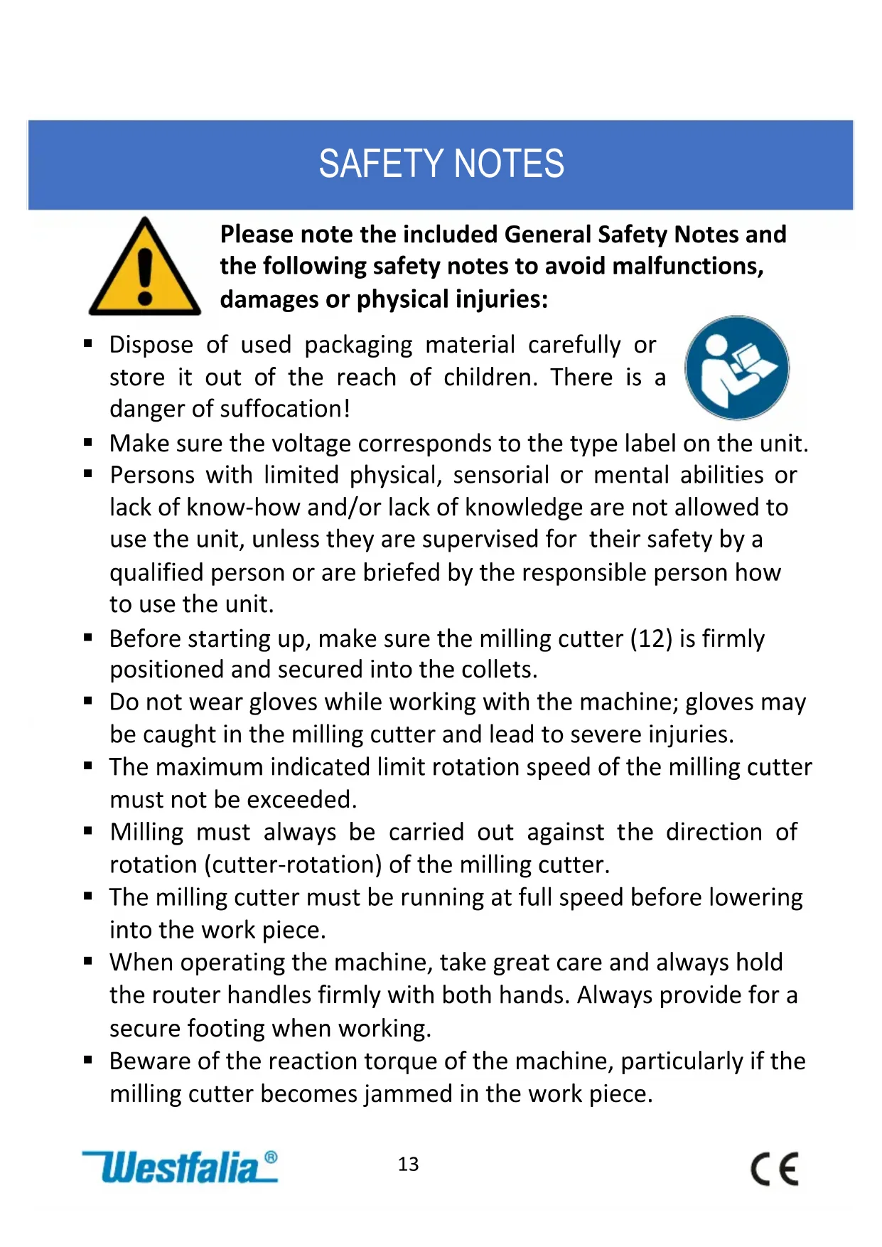 - Beware of the reaction torque of the machine, particularly if the milling cutter becomes jammed in the work piece. SAFETY NOTES14