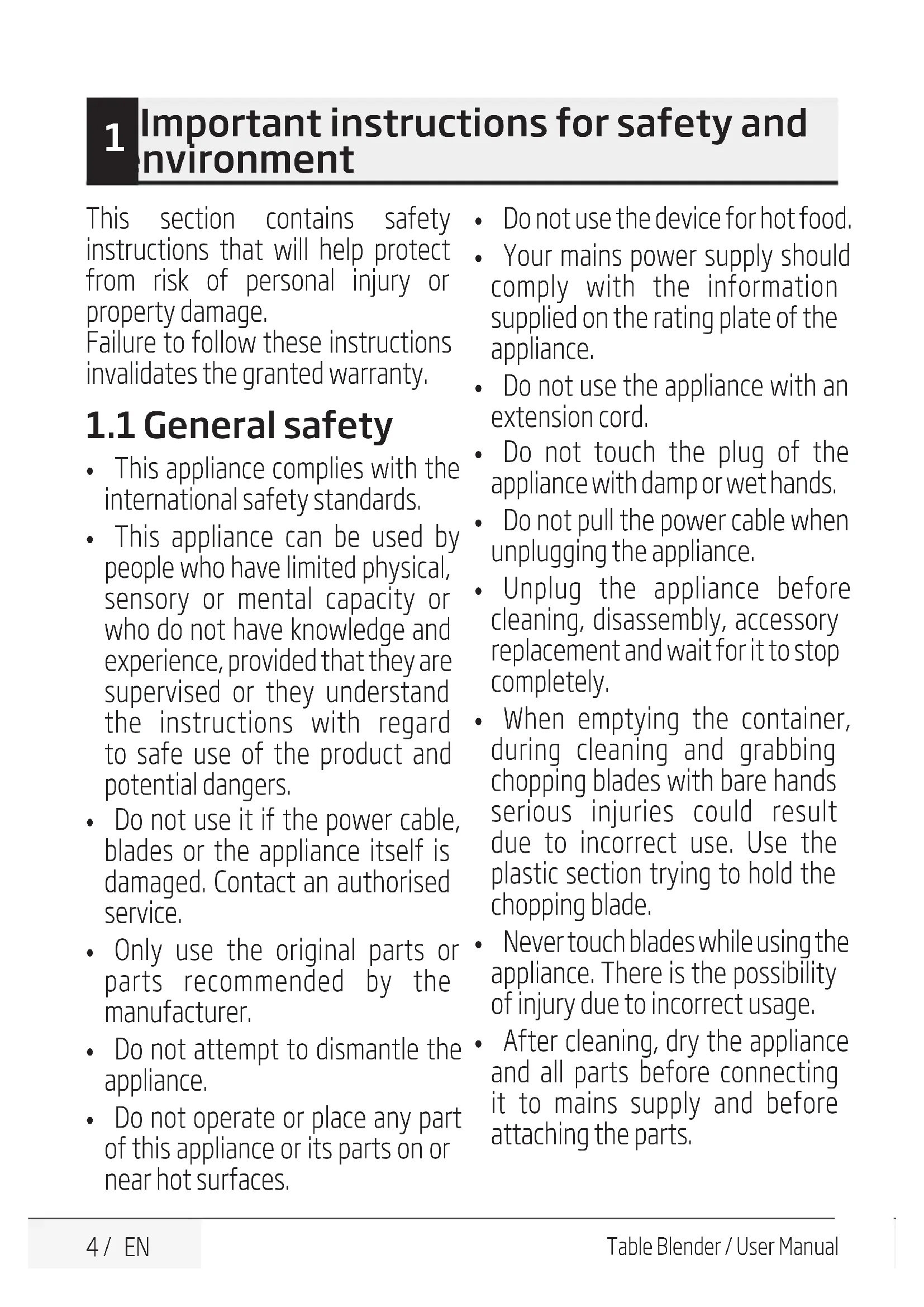 Table Blender / User Manual This section contains safety instructions that will help protect from risk of personal injury or property damage. Failure to follow these instructions invalidates the granted warranty.
