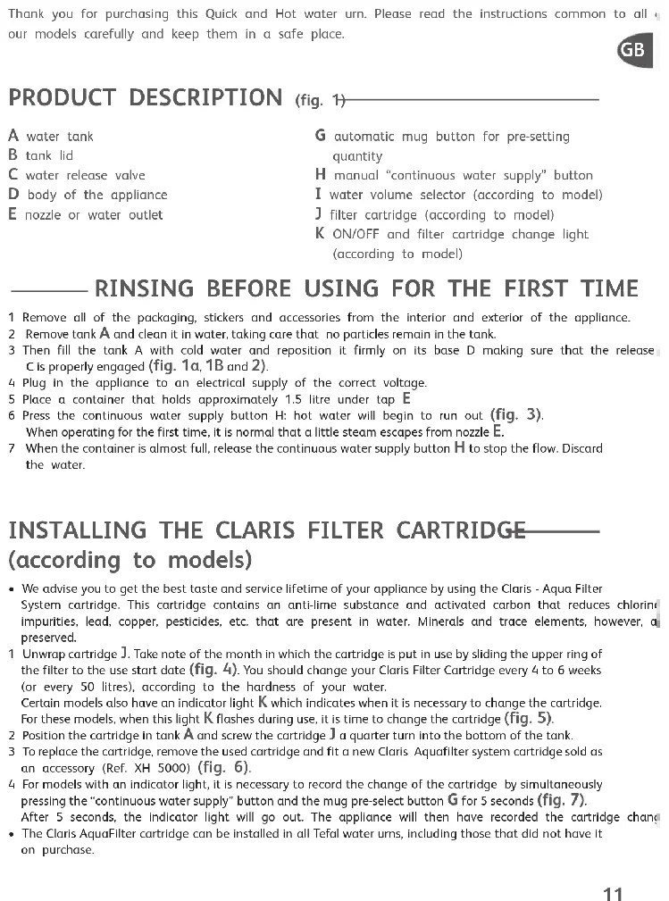 - Place the appliance on a flat, stable, heat resistant surface away from water splashes and any sources of heat. 1 – Put the appliance into the mains. 2 After having removed the lid B, remove and fill the tank A with cold water (fig. 1a and b). 3 Put the tank back in place by pressing firmly and reposition the lid B (fig. 2). 4 Place the desired container under the nozzle E (fig. 8). 5 Press “continuous water supply” button H and you will instantly obtain hot water (fig. 3). Keep it held down until you get the amount of hot water you want. Hot water will stop running as soon as you release the button. 6 You can also use the automatic setting button with a pre-set quantity for mugs. In this case, briefly press button G. The appliance will instantly provide the quantity needed to fill a mug and stop automatically. If you wish, stop the water before the end of the cycle, then again press the same automatic button G (fig. 8). 7 Models equipped with a quantity selector offer an additional function: you can adjust the amount of water automatically delivered to your container. To do this, select the chosen amount on the selector I, then press the auto- matic mug button G; the water flow will stop automatically (fig. 9). 8 If you use small cups, we advise you to bring the cup in close to tap E to avoid splashing. DESCALING your appliance In order to optimise the lifetime of your appliance, we recommend that you descale it at least every 2 months. Descaling should be carried out more frequently if you live in a very hard water area. To de-scale: 1 Remove the Claris filter cartridge (fig. 6). 2 Place a container with at least 1.5 litre under the spout. 3 Empty the tank A if it is is still full of water, then reposition it on its base (fig. 2). 4 Pour 1 litre of commercially available white vinegar at 8° into the tank. 5 Press the continuous water supply button H and the mug pre-select button G simultaneously for at least 10 seconds (fig. 7). 6 The descaling cycle thus run automatically for approximately 10 minutes 7 When the cycle has come to an end, empty the container and refill the water tank to a maximum. Press the “continuous water supply” button H to relaunch a new operation for rinsing the appliance (fig. 3). 8 Once the last cycle has finished, reposition the Claris cartridge and your appliance will again be ready (fig. 6). Never use any other de-scaling method than that recommended.