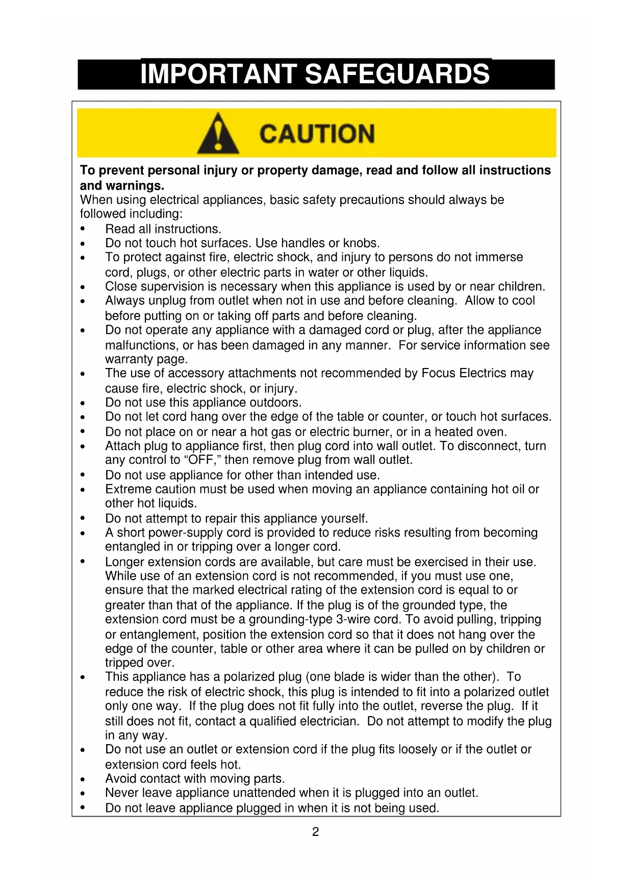 ARRANTY Appliance 1 Year Limited Warranty Focus Electrics, LLC (“Focus Electrics”) warrants this appliance from failures in the material and workmanship for one (1) year from the date of original purchase with proof of purchase, provided the appliance is operated and maintained in conformity with the provided Instruction Manual. Any failed part of the appliance will be repaired or replaced without charge at Focus Electrics’ discretion. This warranty applies to indoor household use only. This warranty does not cover any damage, including discoloration, to any non-stick surface of the appliance. This warranty is null and void, as determined solely by Focus Electrics if the appliance is damaged through accident, misuse, abuse, negligence, scratching, or if the appliance is altered in any way. THIS WARRANTY IS IN LIEU OF ALL IMPLIED WARRANTIES, INCLUDING WARRANTIES OF MERCHANTABILITY, FITNESS FOR A PARTICULAR PURPOSE, PERFORMANCE, OR OTHERWISE, WHICH ARE HEREBY EXCLUDED. IN NO EVENT SHALL FOCUS ELECTRICS BE LIABLE FOR ANY DAMAGES, WHETHER DIRECT, INDIRECT, INCIDENTAL, FORSEEABLE, CONSEQUENTIAL, OR SPECIAL, ARISING OUT OF OR IN CONNECTION WITH THIS APPLIANCE. If you think the appliance has failed or requires service within its warranty period, please contact the Focus Electrics Customer Service Department at (866) 290-1851, or e-mail us at service@focuselectrics.com. A receipt proving the original purchase date will be required for all warranty claims, hand written receipts are not accepted. You may also be required to return the appliance for inspection and evaluation. Return shipping costs are not refundable. Focus Electrics is not responsible for returns lost in transit. Valid only in USA and Canada