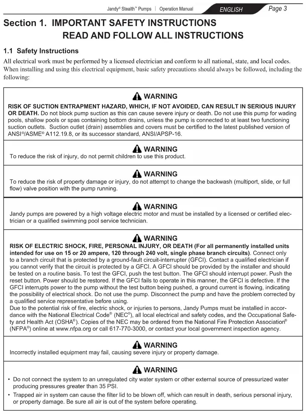 All electrical work must be performed by a licensed electrician and conform to all national, state, and local codes. When installing and using this electrical equipment, basic safety precautions should always be followed, including the following: Page 3 ENGLISH Jandy Stealth Pumps Operation Manual WARNING To reduce the risk of injury, do not permit children to use this product. WARNING To reduce the risk of property damage or injury, do not attempt to change the backwash (multiport, slide, or full ow)valvepositionwiththepumprunning. WARNING Jandypumpsarepoweredbyahighvoltageelectricmotorandmustbeinstalledbyalicensedorcertiedelec- tricianoraqualiedswimmingpoolservicetechnician. WARNING RISK OF ELECTRIC SHOCK, FIRE, PERSONAL INJURY, OR DEATH (For all permanently installed units intended for use on 15 or 20 ampere, 120 through 240 volt, single phase branch circuits). Connect only toabranchcircuitthatisprotectedbyaground-faultcircuit-interrupter(GFCI).Contactaqualiedelectricianif you cannot verify that the circuit is protected by a GFCI. A GFCI should be provided by the installer and should be tested on a routine basis. To test the GFCI, push the test button. The GFCI should interrupt power. Push the reset button. Power should be restored. If the GFCI fails to operate in this manner, the GFCI is defective. If the GFCIinterruptspowertothepumpwithoutthetestbuttonbeingpushed,agroundcurrentisowing,indicating the possibility of electrical shock. Do not use the pump. Disconnect the pump and have the problem corrected by aqualiedservicerepresentativebeforeusing. Duetothepotentialriskofre,electricshock,orinjuriestopersons,JandyPumpsmustbeinstalledinaccor- dance with the National Electrical Code