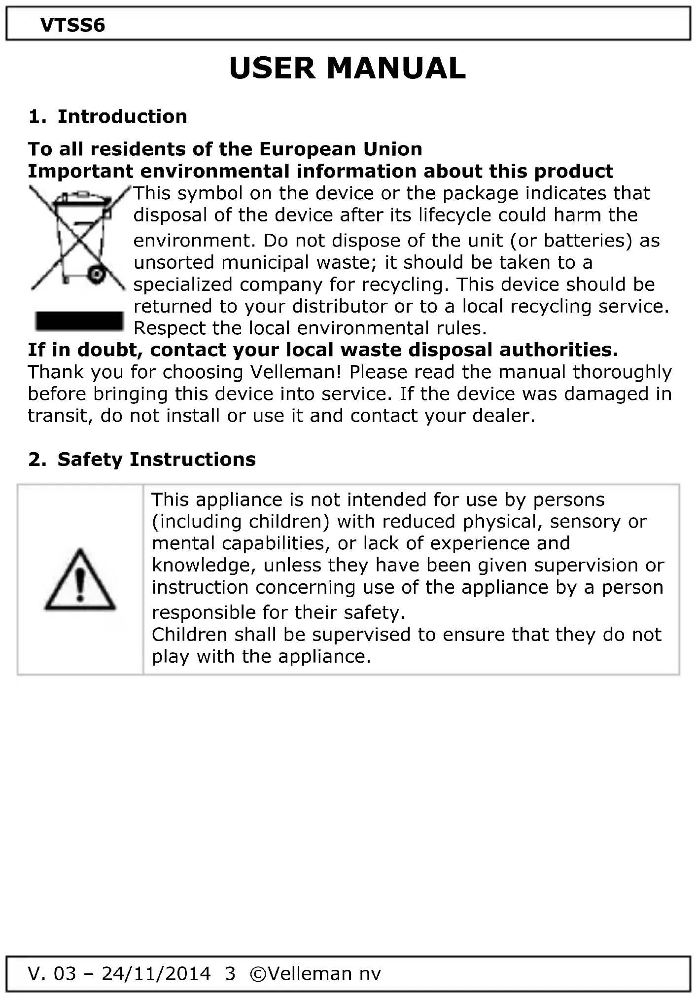 © COPYRIGHT NOTICE The copyright to this manual is owned by Velleman nv. All worldwide rights reserved. No part of this manual may be copied, reproduced, translated or reduced to any electronic medium or otherwise without the prior written consent of the copyright holder.VTSS6