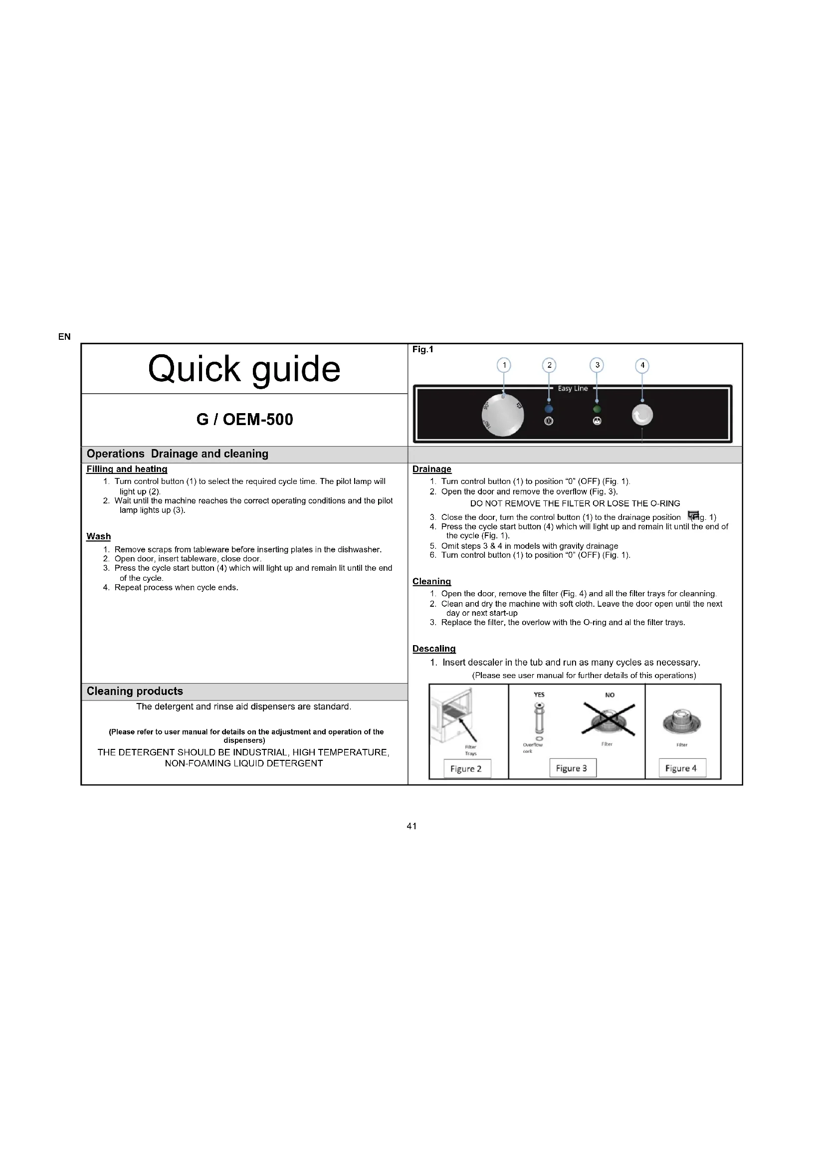 Quick guide Fig.1 G / M-OEM-500 Operations Drainage and cleaning Filling and heating 1. Close the door, push button (1). The led inside the button (1) will light. 2. Wait until the machine reaches the correct operating conditions and the pilot lamp lights up (2). Wash 1. Remove scraps from tableware before inserting plates in the dishwasher. 2. Open door, insert tableware, close door. 3. Select cycle by pressing button (4), (5) or (6). The leds inside the cycle start button, indicate the machine is running. 4. Repeat process when cycle ends. Notes: To speed up the heating process, run a couple of each of the cycles only after the rinse temperature has reached 85°C. If you start the cycle before the rinse cycle has reached a minimum temperature or 85°C. THE WASH CYCLE MAY TAKE LONGER. Drainage 1. While the machine is turned on, open the door. 2. Remove the filters (Fig. 2) and the overflow (Fig. 3). DO NOT REMOVE THE FILTER OR LOSE THE O-RING 3. Push the button (4) for 3 seconds to run drainning. The led light inside the button (4) starts blinking 4. Wait until the (4) button led light off. 5. Omit steps 3 & 4 in models with gravity drainage 6. Push button (1) to switch off the machine and close the door. Regeneration 1. Regeneration cycle in SOFT models must be done after the draining cycle. Machine must be empty. 2. If the LED (3) is on, fill the can of salt inside the device. 3. Open the door. 4. Push button (5) during 3 seconds. 5. Once the led light inside the button (5) starts blinking, close the door. 6. Wait until the (5) button led light off. 7. Clean internal part of machine Cleaning 1. Open the door, remove the filter (Fig. 4) and all the filter trays for cleaning. 2. Replace the filter, overflow with O-ring and all the filter trays. 3. Clean and dry the machine with a soft cloth. Leave the door open until the next day or next time the machine is used. Descaling 1. Insert descaler in the tub and run as many cycles as necessary. (Please see user manual for further details of this operations) Cleaning products The detergent and rinse aid dispensers are standard. (Please refer to user manual for details on the adjustment and operation of the dispensers) THE DETERGENT SHOULD BE INDUSTRIAL, HIGH TEMPERATURE,