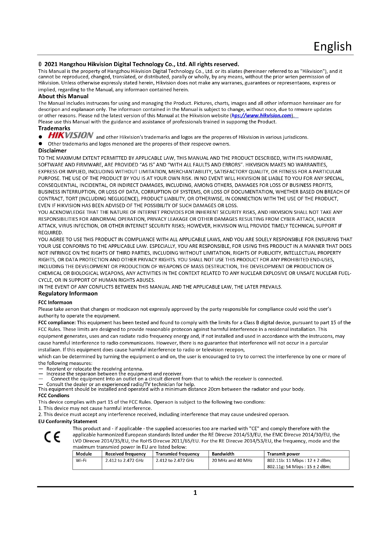 © 2021 Hangzhou Hikvision Digital Technology Co., Ltd. All rights reserved. This Manual is the property of Hangzhou Hikvision Digital Technology Co., Ltd. or its affiliates (hereinafter referred to as "Hikvision"), and it cannot be reproduced, changed, translated, or distributed, partially or wholly, by any means, without the prior written permission of Hikvision. Unless otherwise expressly stated herein, Hikvision does not make any warranties, guarantees or representations, express or implied, regarding to the Manual, any information contained herein. About this Manual The Manual includes instructions for using and managing the Product. Pictures, charts, images and all other information hereinafter are for description and explanation only. The information contained in the Manual is subject to change, without notice, due to firmware updates or other reasons. Please find the latest version of this Manual at the Hikvision website (https://www.hikvision.com). Please use this Manual with the guidance and assistance of professionals trained in supporting the Product. Trademarks and other Hikvision’s trademarks and logos are the properties of Hikvision in various jurisdictions. Other trademarks and logos mentioned are the properties of their respective owners. Disclaimer TO THE MAXIMUM EXTENT PERMITTED BY APPLICABLE LAW, THIS MANUAL AND THE PRODUCT DESCRIBED, WITH ITS HARDWARE, SOFTWARE AND FIRMWARE, ARE PROVIDED “AS IS” AND “WITH ALL FAULTS AND ERRORS”. HIKVISION MAKES NO WARRANTIES, EXPRESS OR IMPLIED, INCLUDING WITHOUT LIMITATION, MERCHANTABILITY, SATISFACTORY QUALITY, OR FITNESS FOR A PARTICULAR PURPOSE. THE USE OF THE PRODUCT BY YOU IS AT YOUR OWN RISK. IN NO EVENT WILL HIKVISION BE LIABLE TO YOU FOR ANY SPECIAL, CONSEQUENTIAL, INCIDENTAL, OR INDIRECT DAMAGES, INCLUDING, AMONG OTHERS, DAMAGES FOR LOSS OF BUSINESS PROFITS, BUSINESS INTERRUPTION, OR LOSS OF DATA, CORRUPTION OF SYSTEMS, OR LOSS OF DOCUMENTATION, WHETHER BASED ON BREACH OF CONTRACT, TORT (INCLUDING NEGLIGENCE), PRODUCT LIABILITY, OR OTHERWISE, IN CONNECTION WITH THE USE OF THE PRODUCT, EVEN IF HIKVISION HAS BEEN ADVISED OF THE POSSIBILITY OF SUCH DAMAGES OR LOSS. YOU ACKNOWLEDGE THAT THE NATURE OF INTERNET PROVIDES FOR INHERENT SECURITY RISKS, AND HIKVISION SHALL NOT TAKE ANY RESPONSIBILITIES FOR ABNORMAL OPERATION, PRIVACY LEAKAGE OR OTHER DAMAGES RESULTING FROM CYBER-ATTACK, HACKER ATTACK, VIRUS INFECTION, OR OTHER INTERNET SECURITY RISKS; HOWEVER, HIKVISION WILL PROVIDE TIMELY TECHNICAL SUPPORT IF REQUIRED. YOU AGREE TO USE THIS PRODUCT IN COMPLIANCE WITH ALL APPLICABLE LAWS, AND YOU ARE SOLELY RESPONSIBLE FOR ENSURING THAT YOUR USE CONFORMS TO THE APPLICABLE LAW. ESPECIALLY, YOU ARE RESPONSIBLE, FOR USING THIS PRODUCT IN A MANNER THAT DOES NOT INFRINGE ON THE RIGHTS OF THIRD PARTIES, INCLUDING WITHOUT LIMITATION, RIGHTS OF PUBLICITY, INTELLECTUAL PROPERTY RIGHTS, OR DATA PROTECTION AND OTHER PRIVACY RIGHTS. YOU SHALL NOT USE THIS PRODUCT FOR ANY PROHIBITED END-USES, INCLUDING THE DEVELOPMENT OR PRODUCTION OF WEAPONS OF MASS DESTRUCTION, THE DEVELOPMENT OR PRODUCTION OF CHEMICAL OR BIOLOGICAL WEAPONS, ANY ACTIVITIES IN THE CONTEXT RELATED TO ANY NUCLEAR EXPLOSIVE OR UNSAFE NUCLEAR FUEL- CYCLE, OR IN SUPPORT OF HUMAN RIGHTS ABUSES. IN THE EVENT OF ANY CONFLICTS BETWEEN THIS MANUAL AND THE APPLICABLE LAW, THE LATER PREVAILS. Regulatory Information FCC Information Please take attention that changes or modification not expressly approved by the party responsible for compliance could void the user’s authority to operate the equipment. FCC compliance: This equipment has been tested and found to comply with the limits for a Class B digital device, pursuant to part 15 of the FCC Rules. These limits are designed to provide reasonable protection against harmful interference in a residential installation. This equipment generates, uses and can radiate radio frequency energy and, if not installed and used in accordance with the instructions, may cause harmful interference to radio communications. However, there is no guarantee that interference will not occur in a particular installation. If this equipment does cause harmful interference to radio or television reception, which can be determined by turning the equipment off and on, the user is encouraged to try to correct the interference by one or more of the following measures: — Reorient or relocate the receiving antenna. — Increase the separation between the equipment and receiver. — Connect the equipment into an outlet on a circuit different from that to which the receiver is connected. — Consult the dealer or an experienced radio/TV technician for help. This equipment should be installed and operated with a minimum distance 20cm between the radiator and your body. FCC Conditions This device complies with part 15 of the FCC Rules. Operation is subject to the following two conditions:
