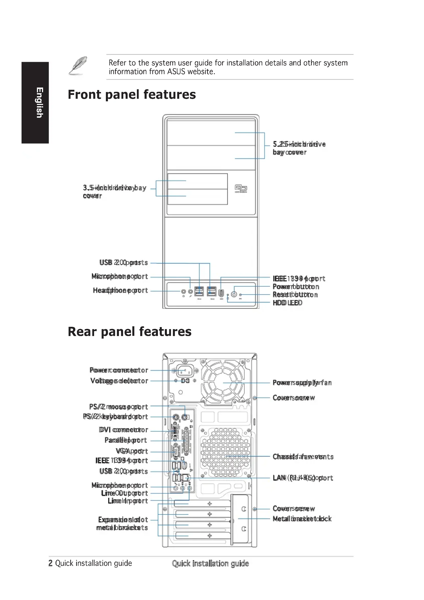 English Vintage V2-AH2 Barebone System Quick Installation Guide2 Quick installation guide English Rear panel features Front panel features Refer to the system user guide for installation details and other system information from ASUS website. 5.25-inch drive bay cover IEEE 1394 port Power button Reset button HDD LED USB 2.0 ports Microphone port 3.5-inch drive bay cover Headphone port DV I