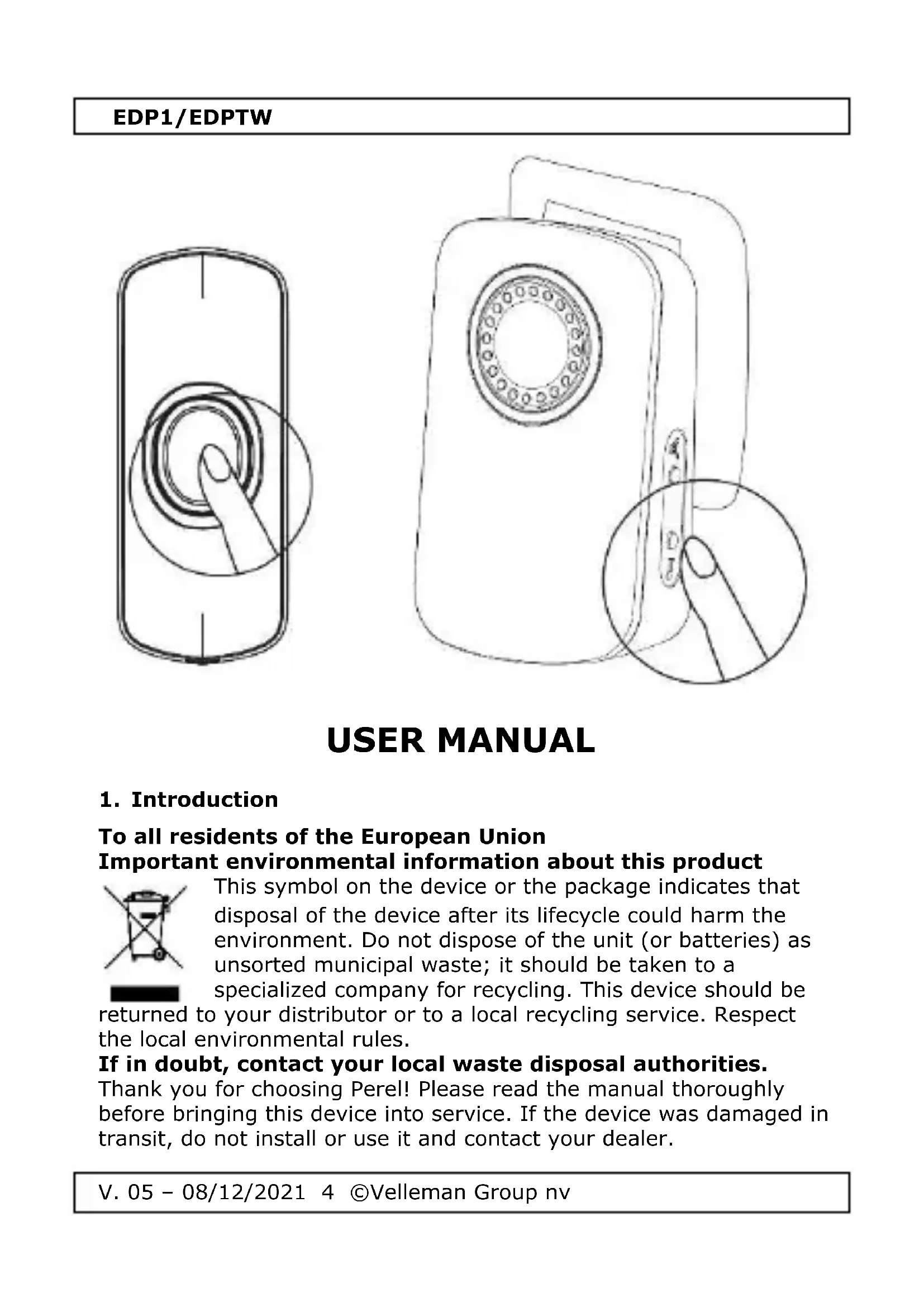 wireless ................................................................ yes operating range .............................. 150 m in open area self-learning .......................................................... yes bell push.......................................... with LED indicator number of sounds ................................................... 32 IP rating (transmitter) .......................................... IP44 power supply transmitter .................................. 1 x CR2032 (incl.) Use this device with original accessories only. Velleman Group nv cannot be held responsible in the event of damage or injury resulting from (incorrect) use of this device. For more info concerning this product and the latest version of this manual, please visit our website www.perel.eu. The information in this manual is subject to change without prior notice. RED Declaration of Conformity Hereby, Velleman Group nv declares that the radio equipment type [EDP1] + [EDPTW] is in compliance with Directive 2014/53/EU. The full text of the EU declaration of conformity is available at the following internet address: www.velleman.eu.EDP1/EDPTW