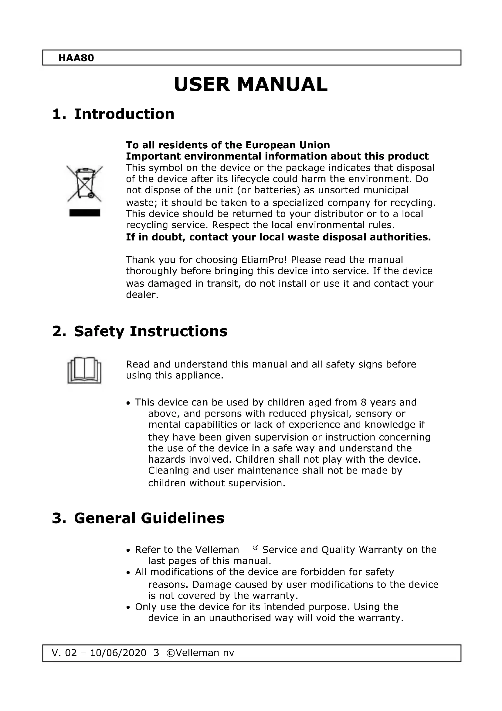- Only use the device for its intended purpose. Using the device in an unauthorised way will void the warranty.HAA80