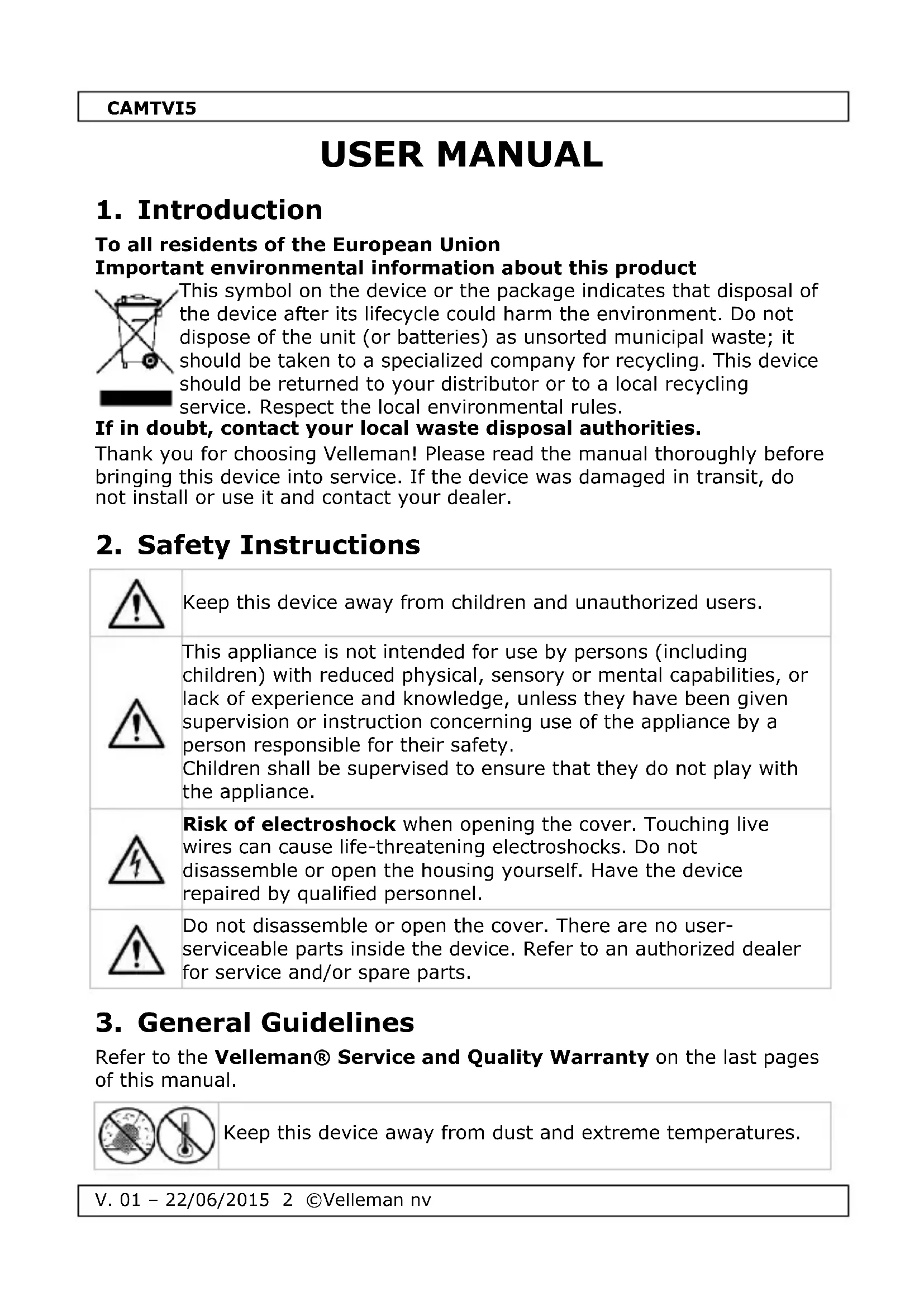 Use this device with original accessories only. Velleman nv cannot be held responsible in the event of damage or injury resulting from (incorrect) use of this device. For more info concerning this product and the latest version of this manual, please visit our website www.velleman.eu. The information in this manual is subject to change without prior notice. © COPYRIGHT NOTICE The copyright to this manual is owned by Velleman nv. All worldwide rights reserved. No part of this manual may be copied, reproduced, translated or reduced to any electronic medium or otherwise without the prior written consent of the copyright holder.CAMTVI5