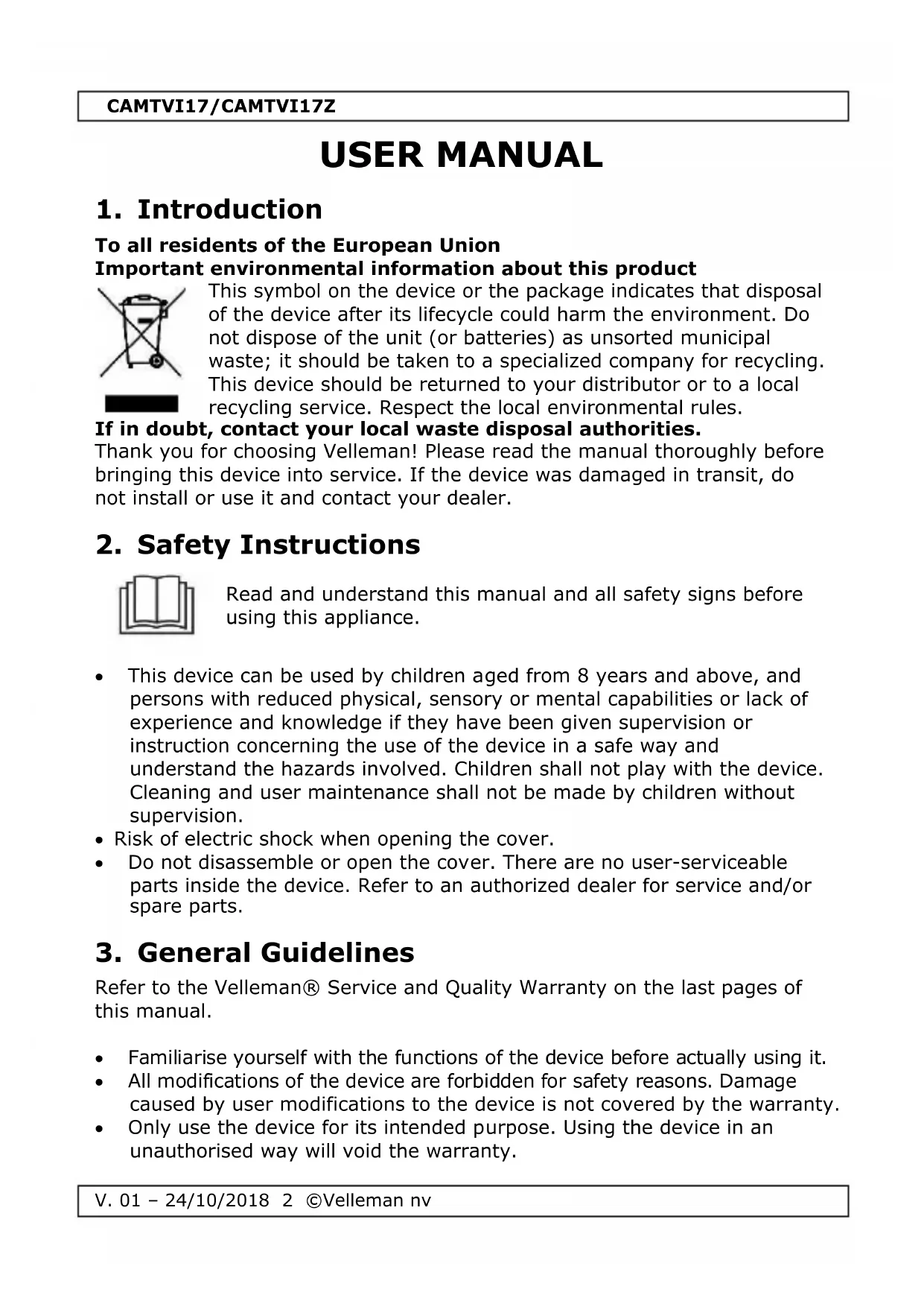 V. 01 – 24/10/2018 3 ©Velleman nv