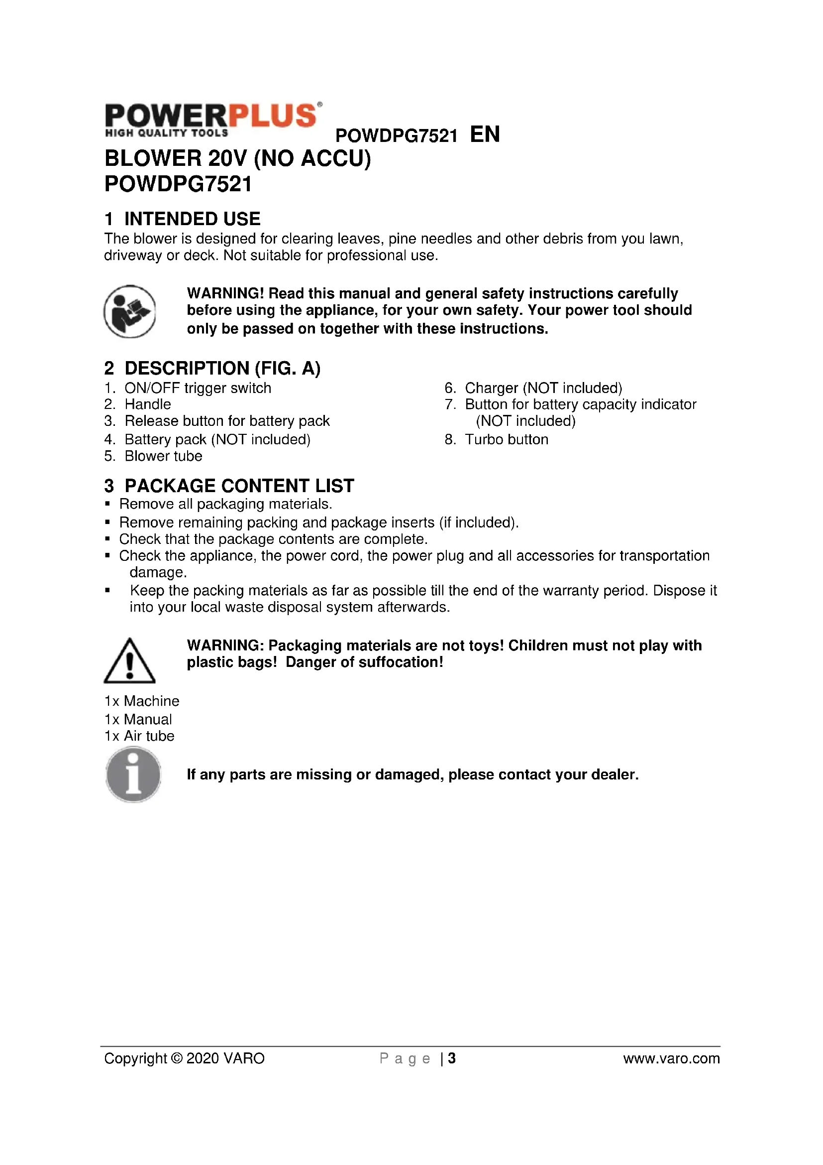 Copyright © 2020 VARO P a g e | 3 www.varo.com BLOWER 20V (NO ACCU) POWDPG7521 1 INTENDED USE The blower is designed for clearing leaves, pine needles and other debris from you lawn, driveway or deck. Not suitable for professional use. WARNING! Read this manual and general safety instructions carefully before using the appliance, for your own safety. Your power tool should only be passed on together with these instructions. 2 DESCRIPTION (FIG. A)