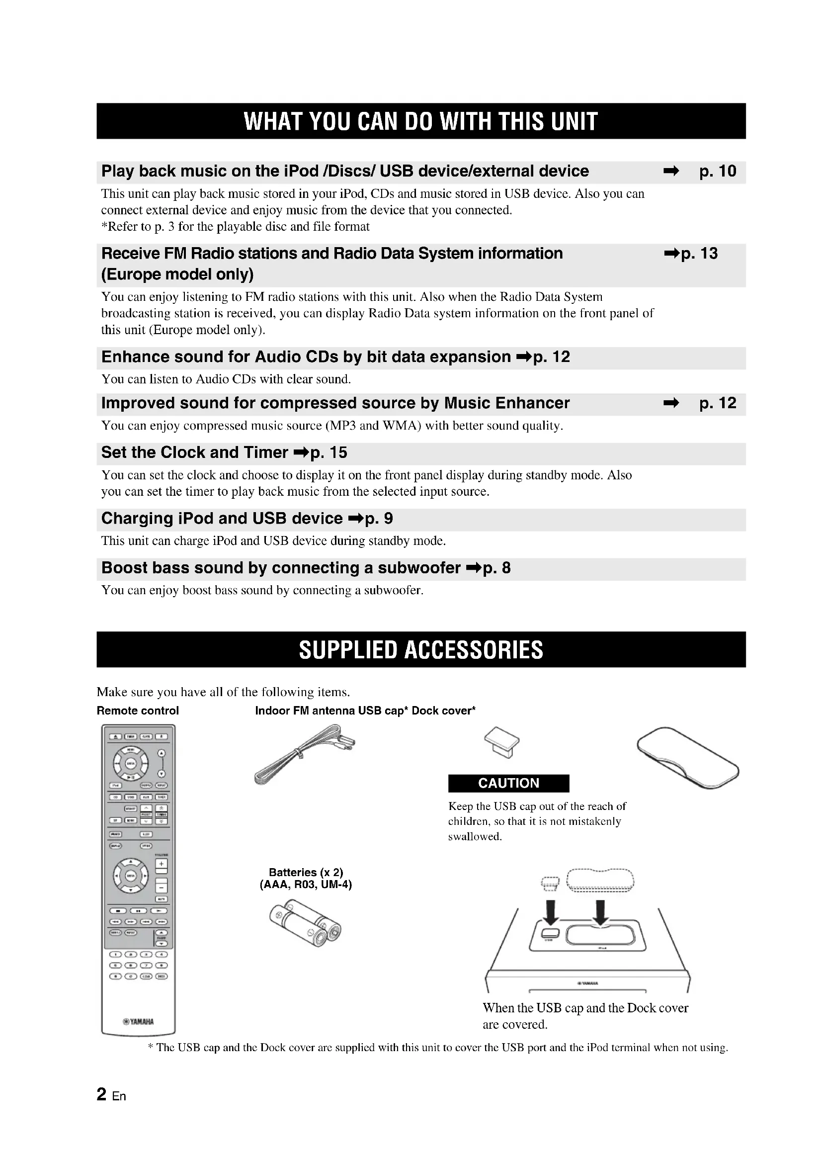 - This manual is printed prior to production. Design and specifications are subject to change in part as a result of improvements, etc. In case of differences between the manual and the product, the product has priority.2 En PREPARATION Make sure you have all of the following items. WHAT YOU CAN DO WITH THIS UNIT Play back music on the iPod /Discs/ USB device/external device \ p. 10 This unit can play back music stored in your iPod, CDs and music stored in USB device. Also you can connect external device and enjoy music from the device that you connected. *Refer to p. 3 for the playable disc and file format Receive FM Radio stations and Radio Data System information (Europe model only) \ p. 13 You can enjoy listening to FM radio stations with this unit. Also when the Radio Data System broadcasting station is received, you can display Radio Data system information on the front panel of this unit (Europe model only). Enhance sound for Audio CDs by bit data expansion \ p. 12 You can listen to Audio CDs with clear sound. Improved sound for compressed source by Music Enhancer \ p. 12 You can enjoy compressed music source (MP3 and WMA) with better sound quality. Set the Clock and Timer \ p. 15 You can set the clock and choose to display it on the front panel display during standby mode. Also you can set the timer to play back music from the selected input source. Charging iPod and USB device \ p. 9 This unit can charge iPod and USB device during standby mode. Boost bass sound by connecting a subwoofer \ p. 8 You can enjoy boost bass sound by connecting a subwoofer. SUPPLIED ACCESSORIES Remote controlBatteries (x 2)(AAA, R03, UM-4)Indoor FM antenna USB cap* Dock cover* Keep the USB cap out of the reach of children, so that it is not mistakenly swallowed. CAUTION
