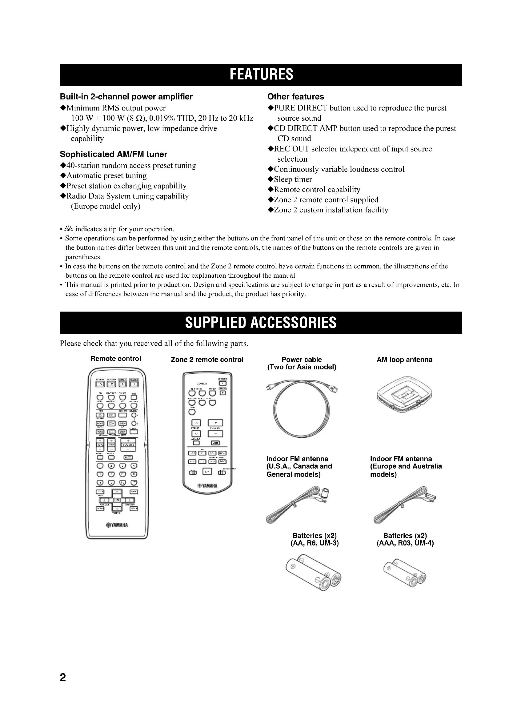 CAUTION: READ THIS BEFORE OPERATING YOUR UNIT. WARNING TO REDUCE THE RISK OF FIRE OR ELECTRIC SHOCK, DO NOT EXPOSE THIS UNIT TO RAIN OR MOISTURE. As long as this unit is connected to the AC wall outlet, it is not disconnected from the AC power source even if you turn off this unit by MASTER ON/OFF, or MAIN ZONE ON/OFF and ZONE 2 ON/OFF. In this state, this unit is designed to consume a very small quantity of power.1 PREPARATIONINTRODUCTION BASIC OPERATION ADDITIONAL INFORMATION ADVANCED OPERATION English FEATURES............................................................. 2 SUPPLIED ACCESSORIES ................................. 2