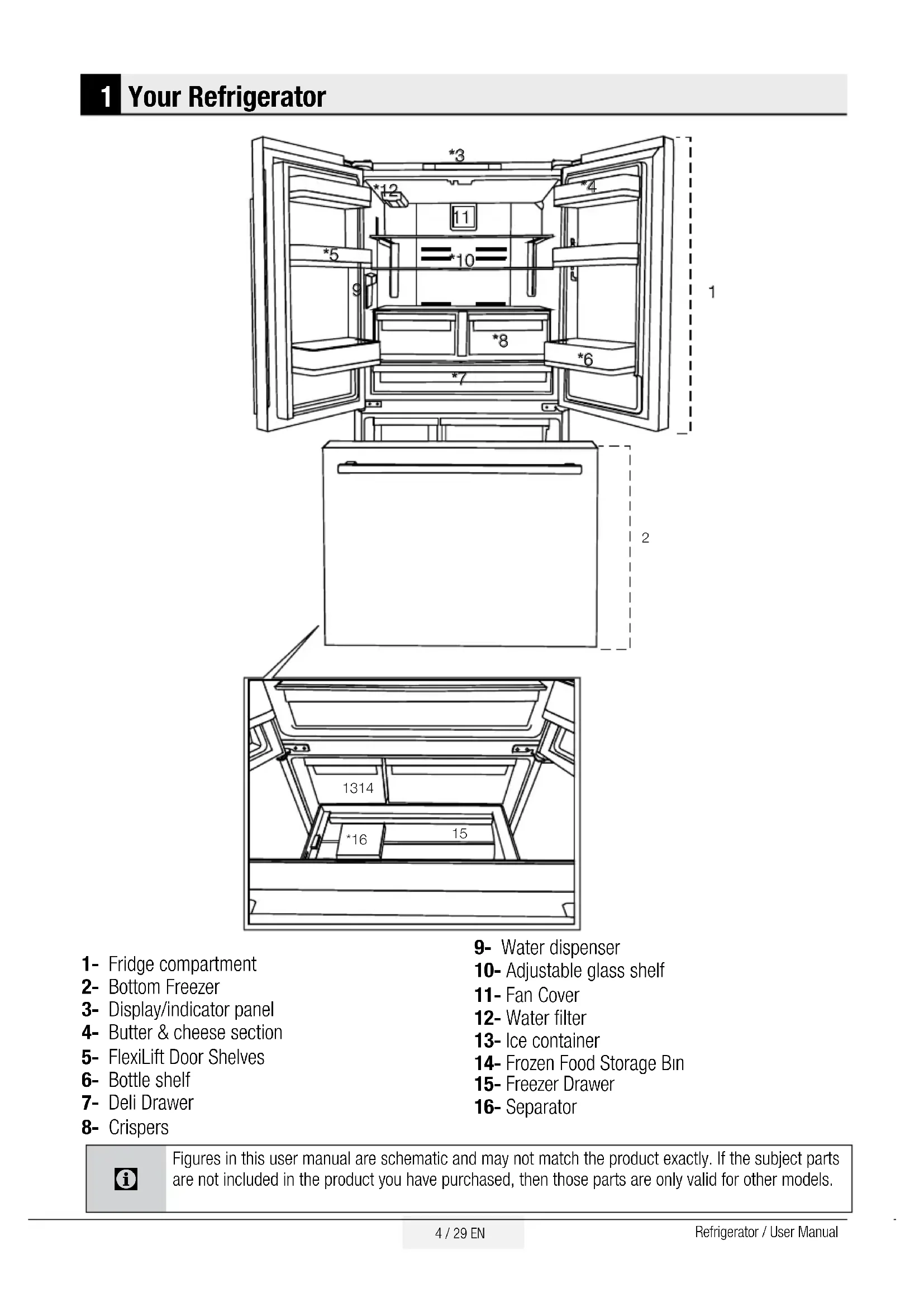 and hold the Power button for three seconds to turn the unit on. t Condensation on the side wall of the fresh food compartment (MULTI ZONE, COOL, CONTROL and FLEXI ZONE). t The door is opened too frequently >>> Take care not to open the product’s door too frequently. t The environment is too humid. >>> Do not install the product in humid environments. t 'PPETDPOUBJOJOHMJRVJETBSFLFQUJOVOTFBMFEIPMEFST,FFQUIFGPPETDPOUBJOJOHMJRVJETJOTFBMFE holders. t The product’s door is left open. >>> Do not keep the product’s door open for long periods. t The thermostat is set to too low temperature. >>> Set the thermostat to appropriate temperature. Compressor is not working. t In case of sudden power failure or pulling the power plug off and putting back on, the gas pressure in the product’s cooling system is not balanced, which triggers the compressor thermic safeguard. The product will restart after approximately 6 minutes. If the product does not restart after this period, contact a servicer. t Defrosting is active. >>> This is normal for a fully-automatic defrosting product. The defrosting is carried out periodically. t The product is not plugged in. >>> Make sure the power cord is plugged in. t The temperature setting is incorrect. >>> Select the appropriate temperature setting. t The power is out. >>> The product will continue to operate normally once the power is restored. The refrigerator’s operating noise is increasing while in use. t The product’s operating performance may vary depending on the ambient temperature variations. This is normal and not a malfunction. The refrigerator runs too often or for too long. t The new product may be larger than the previous one. Larger products will run for longer periods. t The room temperature may be high. >>> The product will normally run for long periods in higher room temperature. t The product may have been recently plugged in or a new food item is placed inside. >>> The product will take longer to reach the set temperature when recently plugged in or a new food item is placed inside. This is normal. t Large quantities of hot food may have been recently placed into the product. >>> Do not place hot food into the product. t The doors were opened frequently or kept open for long periods. >>> The warm air moving inside will cause the product to run longer. Do not open the doors too frequently. t 5IFGSFF[FSPSGSFTIGPPEDPNQBSUNFOUEPPSNBZCFBKBS$IFDLUIBUUIFEPPSTBSFGVMMZDMPTFE t The product may be set to temperature too low. >>> Set the temperature to a higher degree and wait GPSUIFQSPEVDUUPSFBDIUIFBEKVTUFEUFNQFSBUVSF t The fresh food compartment or freezer door washer may be dirty, worn out, broken or not properly settled. >>> Clean or replace the washer. Damaged / torn door washer will cause the product to run for longer periods to preserve the current temperature.27 / 29 EN Refrigerator / User Manual Troubleshooting The freezer temperature is very low, but the fresh food compartment temperature is adequate. t The freezer compartment temperature is set to a very low degree. >>> Set the freezer compartment temperature to a higher degree and check again. The fresh food compartment temperature is very low, but the freezer temperature is adequate. t The fresh food compartment temperature is set to a very low degree. >>> Set the freezer compartment temperature to a higher degree and check again. The food items kept in fresh food compartment drawers are frozen. t The fresh food compartment temperature is set to a very low degree. >>> Set the freezer compartment temperature to a higher degree and check again. The temperature in the fresh food compartment or the freezer is too high. t The fresh food compartment temperature is set to a very high degree. >>> Temperature setting of the fresh food compartment has an effect on the temperature in the freezer compartment. Wait until the temperature of relevant parts reach the sufficient level by changing the temperature of fresh food compartment or freezer compartments. t The doors were opened frequently or kept open for long periods. >>> Do not open the doors too frequently. t 5IFEPPSNBZCFBKBS'VMMZDMPTFUIFEPPS t The product may have been recently plugged in or a new food item is placed inside. >>> This is normal. The product will take longer to reach the set temperature when recently plugged in or a new food item is placed inside. t Large quantities of hot food may have been recently placed into the product. >>> Do not place hot food into the product. Shaking or noise. t 5IFHSPVOEJTOPUMFWFMPSGJSN*GUIFQSPEVDUJTTIBLJOHXIFONPWFETMPXMZBEKVTUUIFGFFUUP CBMBODFUIFQSPEVDU"MTPNBLFTVSFUIFHSPVOEJTTVGGJDJFOUMZGJSNUPCFBSUIFQSPEVDU t "OZJUFNTQMBDFEPOUIFQSPEVDUNBZDBVTFOPJTF3FNPWFBOZJUFNTQMBDFEPOUIFQSPEVDU The product is making noise of liquid flowing, spraying etc. t The product’s operating principles involve liquid and gas flows. >>> This is normal and not a malfunction. There is sound of wind blowing coming from the product. t The product uses a fan for the cooling process. This is normal and not a malfunction. There is condensation on the product’s internal walls. t Hot or humid weather will increase icing and condensation. This is normal and not a malfunction. t The doors were opened frequently or kept open for long periods. >>> Do not open the doors too frequently; if open, close the door. t 5IFEPPSNBZCFBKBS'VMMZDMPTFUIFEPPS There is condensation on the product’s exterior or between the doors. t The ambient weather may be humid, this is quite normal in humid weather. >>> The condensation will dissipate when the humidity is reduced. The interior smells bad. t The product is not cleaned regularly. >>> Clean the interior regularly using sponge, warm water and carbonated water. t Certain containers and packaging materials may cause odor. >>> Use containers and packaging materials free of odor.28 / 29 EN Refrigerator / User Manual Troubleshooting t 5IFGPPETXFSFQMBDFEJOVOTFBMFEDPOUBJOFST,FFQUIFGPPETJOTFBMFEDPOUBJOFST.JD