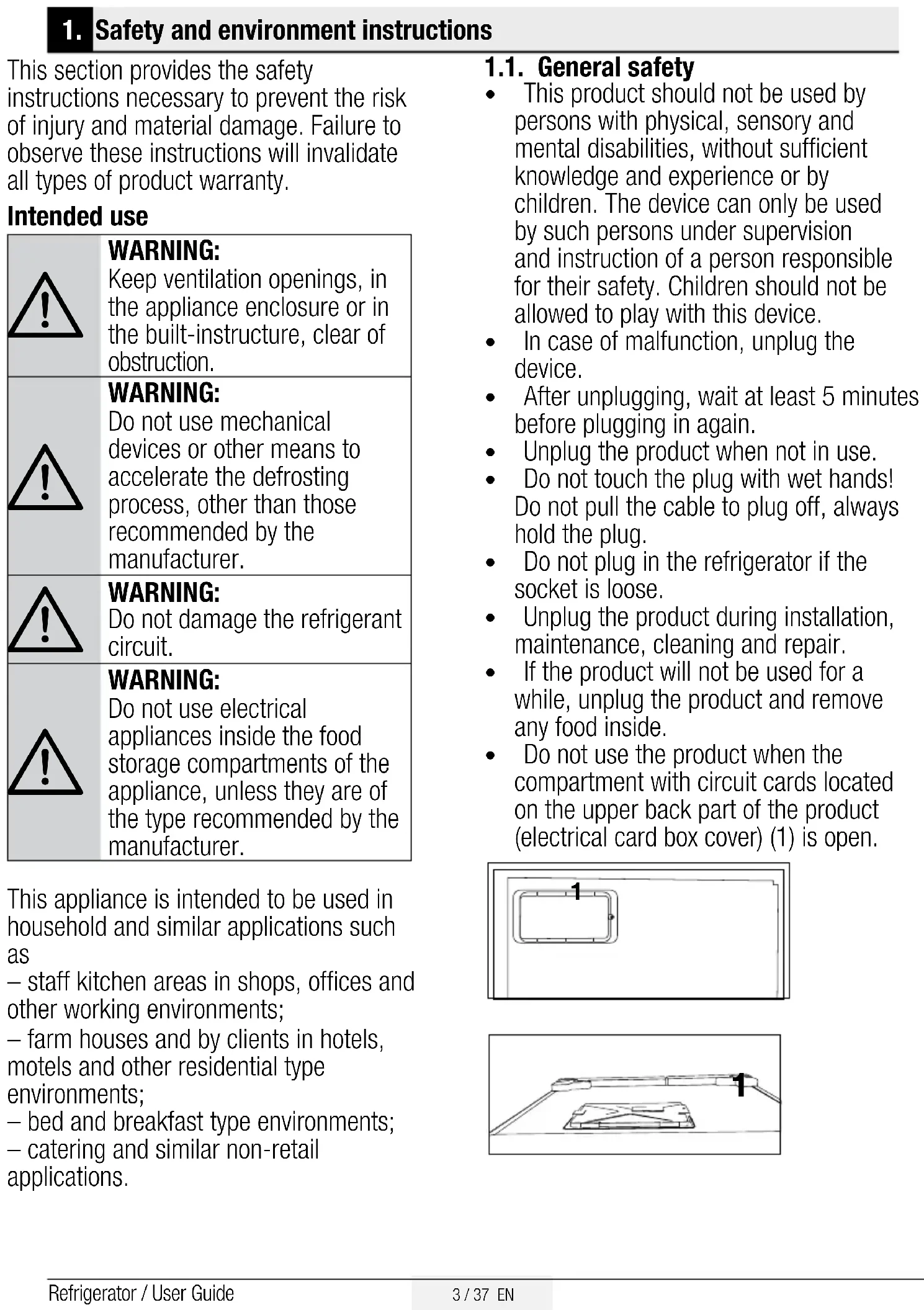 – staff kitchen areas in shops, offices and other working environments; – farm houses and by clients in hotels, motels and other residential type environments; – bed and breakfast type environments; – catering and similar non-retail applications. 1.1. General safety t This product should not be used by persons with physical, sensory and mental disabilities, without sufficient knowledge and experience or by children. The device can only be used by such persons under supervision and instruction of a person responsible for their safety. Children should not be allowed to play with this device. t In case of malfunction, unplug the device. t After unplugging, wait at least 5 minutes before plugging in again. t Unplug the product when not in use. t Do not touch the plug with wet hands! Do not pull the cable to plug off, always hold the plug. t Do not plug in the refrigerator if the socket is loose. t Unplug the product during installation, maintenance, cleaning and repair. t If the product will not be used for a while, unplug the product and remove any food inside. t Do not use the product when the compartment with circuit cards located on the upper back part of the product (electrical card box cover) (1) is open.