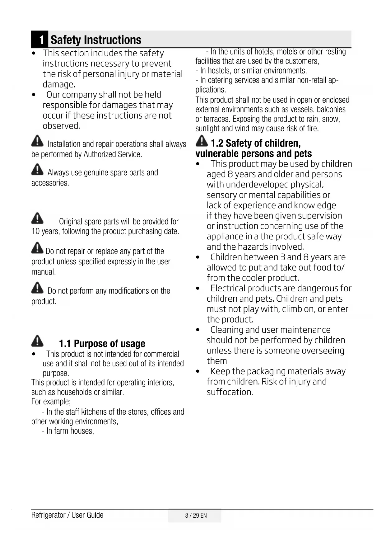 8 Troubleshooting 293 / 29 EN Refrigerator / User Guide 1 Safety Instructions t This section includes the safety instructions necessary to prevent the risk of personal injury or material damage. t Our company shall not be held responsible for damages that may occur if these instructions are not observed. Installation and repair operations shall always be performed by Authorized Service. Always use genuine spare parts and accessories. Original spare parts will be provided for 10 years, following the product purchasing date. Do not repair or replace any part of the product unless specified expressly in the user manual. Do not perform any modifications on the product.