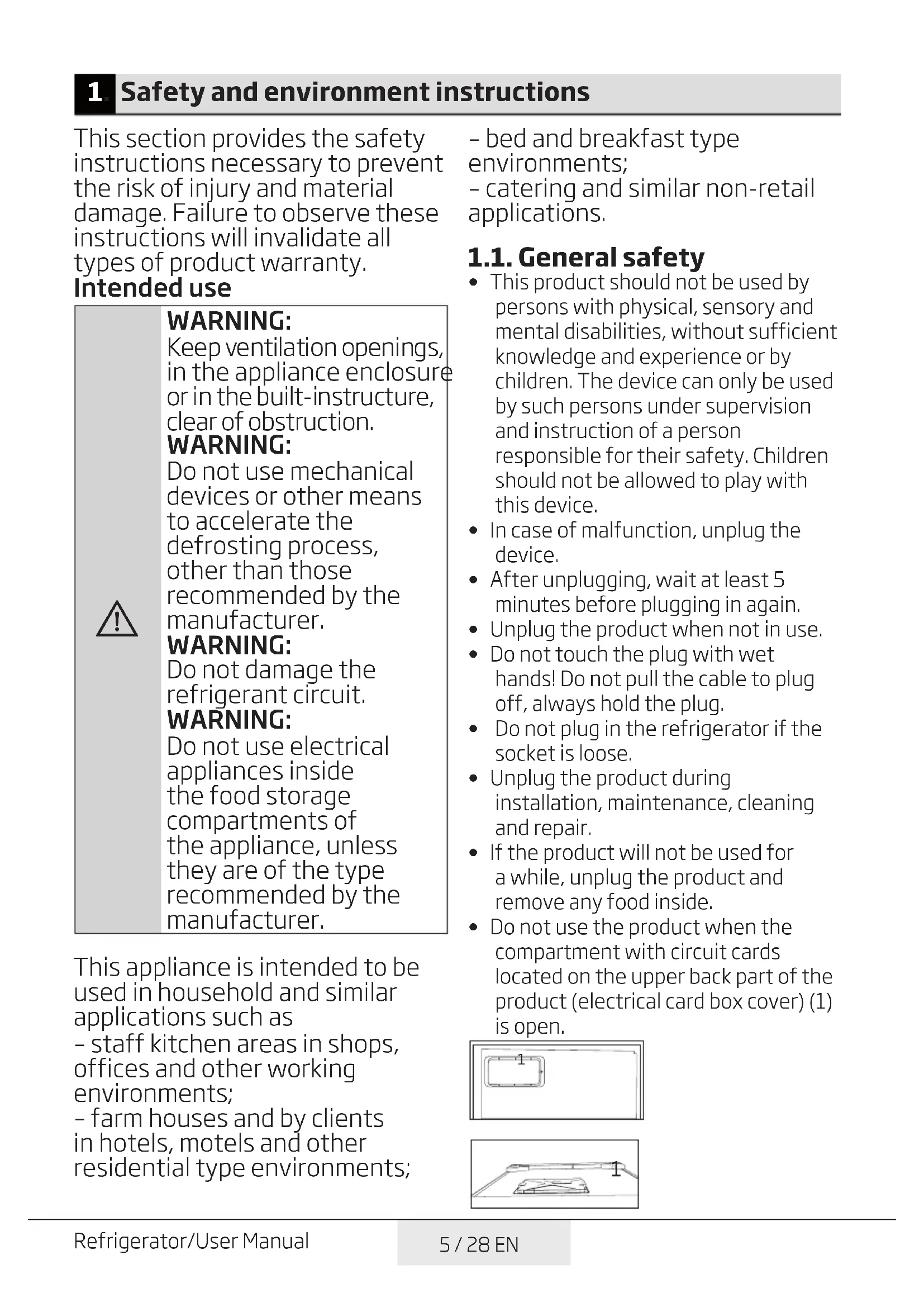 Do not use electrical appliances inside the food storage compartments of the appliance, unless they are of the type recommended by the manufacturer. This appliance is intended to be used in household and similar applications such as – staff kitchen areas in shops, offices and other working environments; – farm houses and by clients in hotels, motels and other residential type environments; – bed and breakfast type environments; – catering and similar non-retail applications. 1.1. General safety