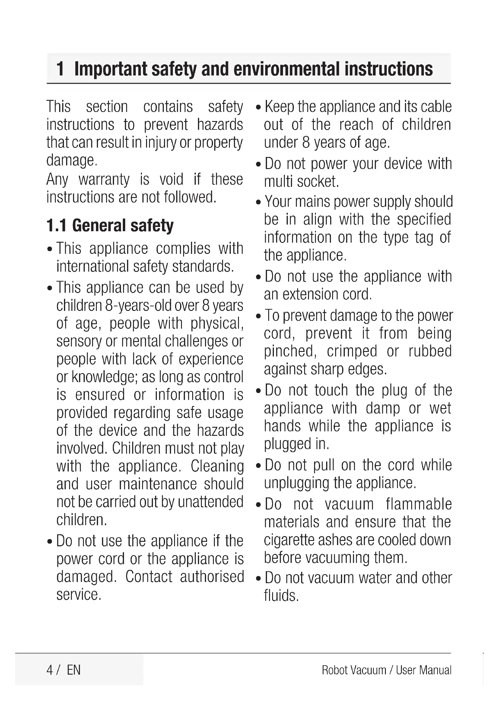 - The children shall be supervised to prevent them from playing with the appliance. 1 Important safety and environmental instructions6 / EN Robot Vacuum / User Manual 1 Important safety and environmental instructions