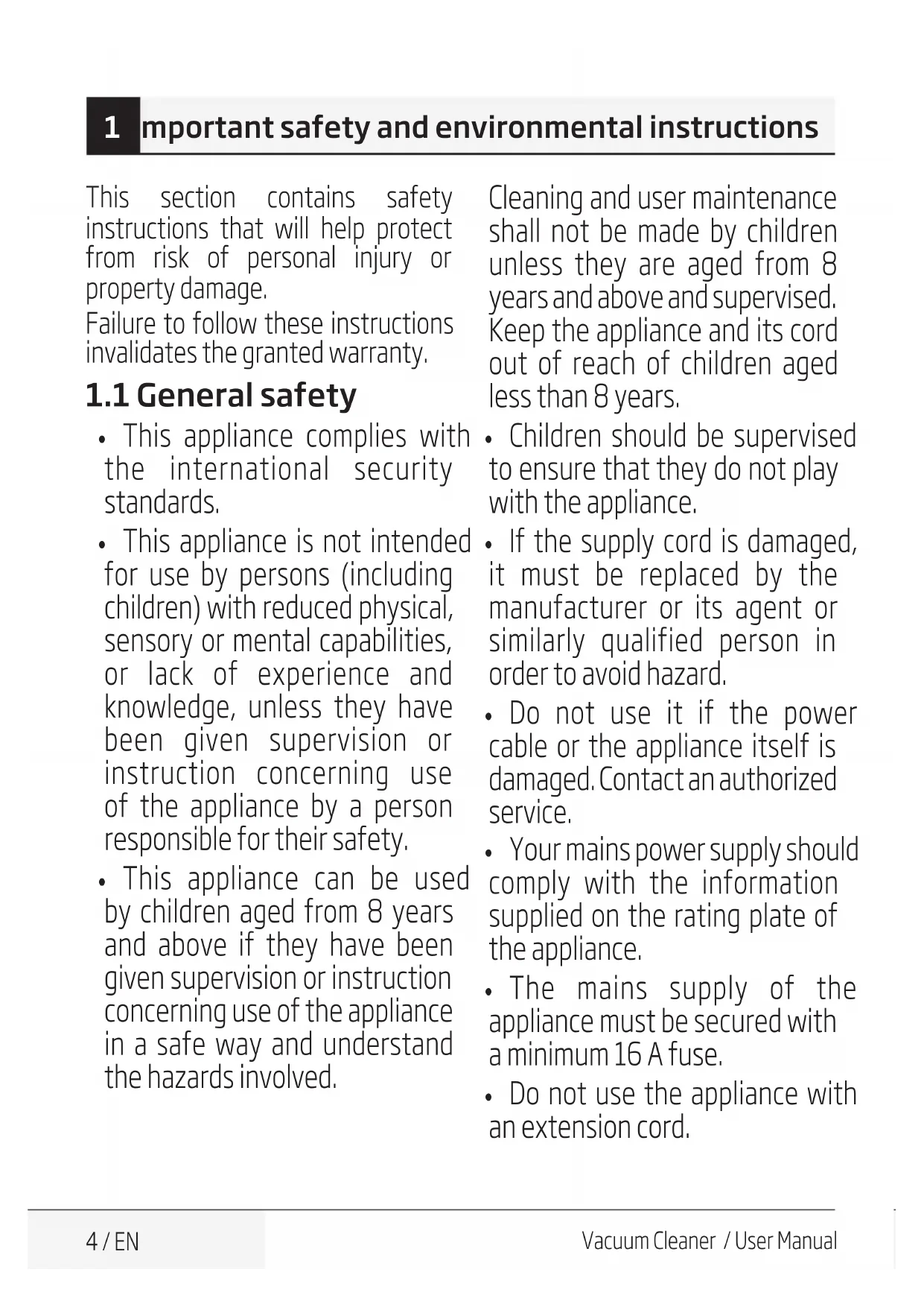 - Do not use the appliance with an extension cord. 1 Important safety and environmental instructionsVacuum Cleaner / User Manual 5 / EN