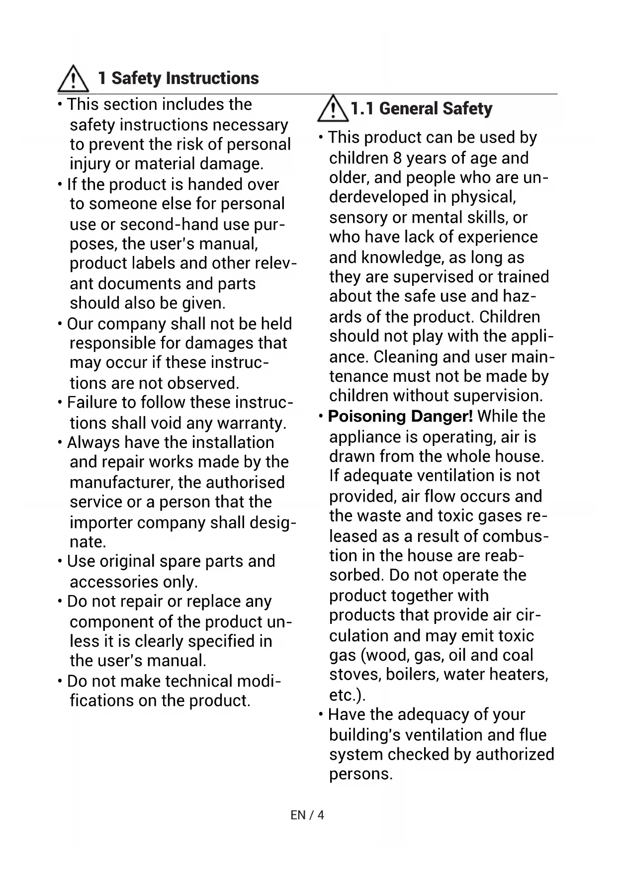 - Poisoning Danger! While the appliance is operating, air is drawn from the whole house. If adequate ventilation is not provided, air flow occurs and the waste and toxic gases re- leased as a result of combus- tion in the house are reab- sorbed. Do not operate the product together with products that provide air cir- culation and may emit toxic gas (wood, gas, oil and coal stoves, boilers, water heaters, etc.).
