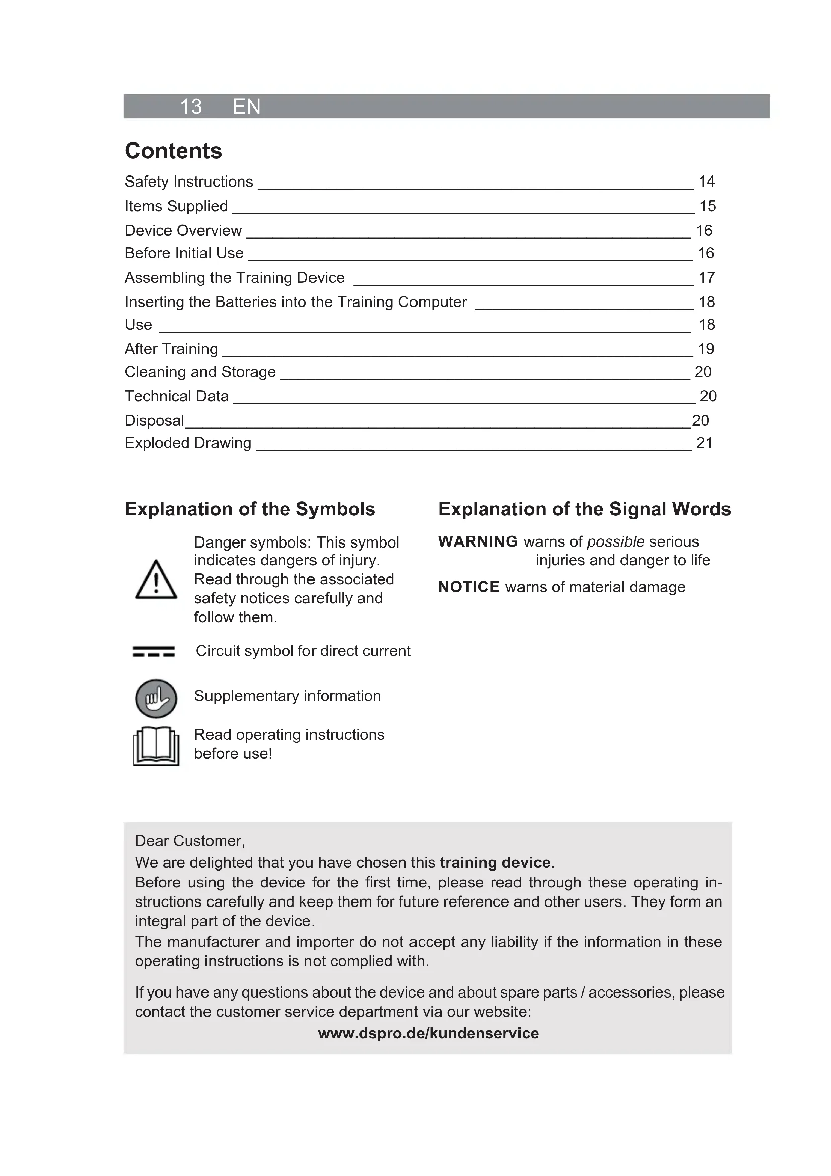 If the training computer stops working, the battery needs to be replaced. Use PLEASE NOTE! ■ When doing the exercises, wear loose, comfortable clothing and non-slip trainers. ■ Ensure that you are properly warmed up before you use the training device. ■ Never stand on the training device. ■ Do not leave the training device unsupervised in the presence of children and ani- mals. ■ We explicitly point out that improper use of the training device and excessive training can be detrimental to your health.19 EN