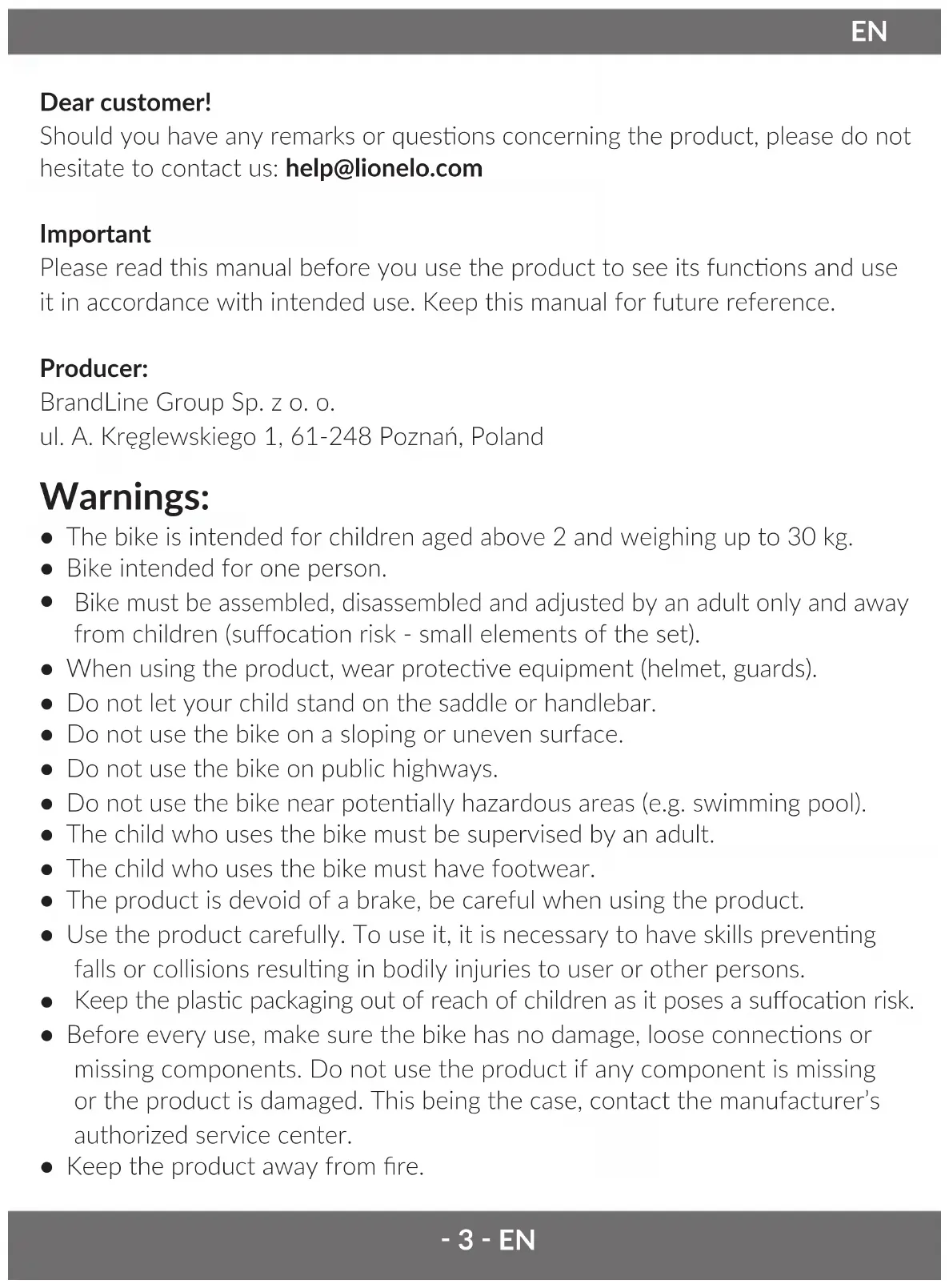 Dear customer! Should you have any remarks or quesons concerning the product, please do not hesitate to contact us: help@lionelo.com Important Please read this manual before you use the product to see its funcons and use it in accordance with intended use. Keep this manual for future reference. Producer: BrandLine Group Sp. z o. o. ul. A. Kręglewskiego 1, 61-248 Poznań, Poland Warnings: