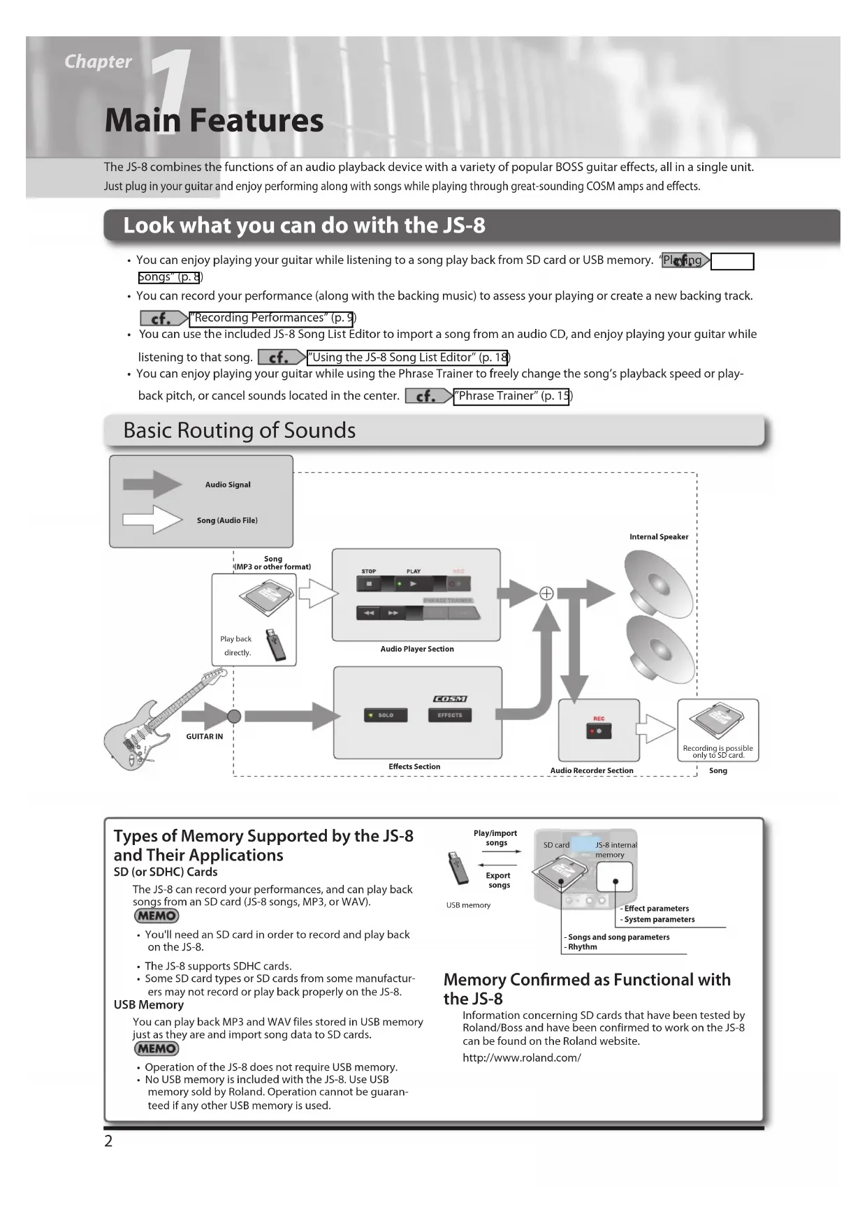 - You can use the included JS-8 Song List Editor to import a song from an audio CD, and enjoy playing your guitar while listening to that song. ”Using the JS-8 Song List Editor” (p. 18)• You can enjoy playing your guitar while using the Phrase Trainer to freely change the song’s playback speed or play-back pitch, or cancel sounds located in the center. ”Phrase Trainer” (p. 15) The JS-8 combines the functions of an audio playback device with a variety of popular BOSS guitar effects, all in a single unit. Just plug in your guitar and enjoy performing along with songs while playing through great-sounding COSM amps and effects. Types of Memory Supported by the JS-8 and Their Applications SD (or SDHC) CardsThe JS-8 can record your performances, and can play back songs from an SD card (JS-8 songs, MP3, or WAV).• You'll need an SD card in order to record and play back on the JS-8.990, 991• The JS-8 supports SDHC cards.• Some SD card types or SD cards from some manufactur-ers may not record or play back properly on the JS-8.USB MemoryYou can play back MP3 and WAV files stored in USB memory just as they are and import song data to SD cards.• Operation of the JS-8 does not require USB memory.• No USB memory is included with the JS-8. Use USB memory sold by Roland. Operation cannot be guaran-teed if any other USB memory is used.SD cardUSB memory- Songs and song parameters- Eect parameters- System parameters- RhythmPlay/import songsExport songsJS-8 internal memory Memory Conrmed as Functional with the JS-8 Information concerning SD cards that have been tested by Roland/Boss and have been confirmed to work on the JS-8 can be found on the Roland website.http://www.roland.com/Play back directly.Recording is possible only to SD card.Audio Player SectionEects SectionGUITAR INAudio Recorder Section Song Internal Speaker Song (MP3 or other format)Audio SignalSong (Audio File)3 Main Features NederlandsPortuguêsEspañolItalianoFrançaisDeutschEnglish Sound Path When Used with Connected Devices You can use the JS-8 with digital audio players, computers, and other devices to play sounds and more. Songs Supported by the JS-8 The JS-8 works with songs in the following formats. JS-8 Songs (Recording/Playback)