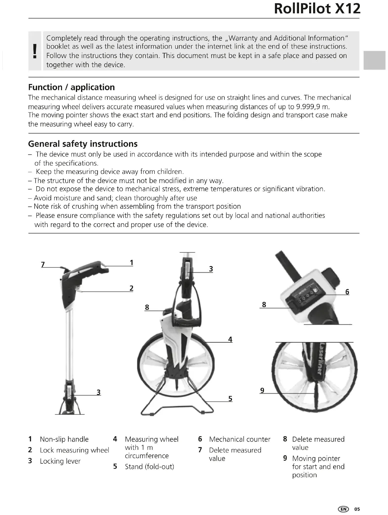 Function / application The mechanical distance measuring wheel is designed for use on straight lines and curves. The mechanical measuring wheel delivers accurate measured values when measuring distances of up to 9.999,9 m. The moving pointer shows the exact start and end positions. The folding design and transport case make the measuring wheel easy to carry. General safety instructions – The device must only be used in accordance with its intended purpose and within the scope of the specications. – Keep the measuring device away from children. – The structure of the device must not be modied in any way. – Do not expose the device to mechanical stress, extreme temperatures or signicant vibration. – Avoid moisture and sand; clean thoroughly after use – Note risk of crushing when assembling from the transport position – Please ensure compliance with the safety regulations set out by local and national authorities with regard to the correct and proper use of the device.
