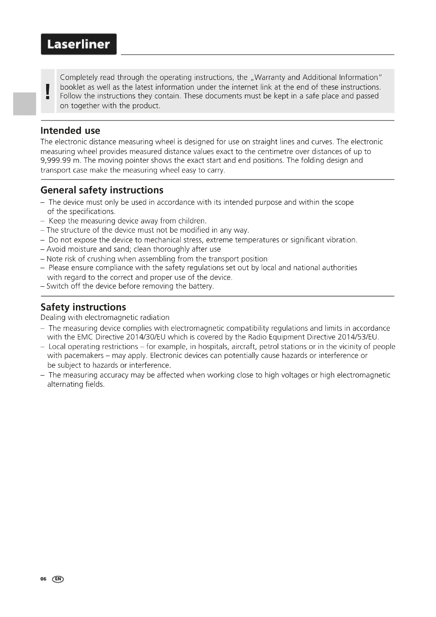 Intended use The electronic distance measuring wheel is designed for use on straight lines and curves. The electronic measuring wheel provides measured distance values exact to the centimetre over distances of up to 9,999.99 m. The moving pointer shows the exact start and end positions. The folding design and transport case make the measuring wheel easy to carry. General safety instructions – The device must only be used in accordance with its intended purpose and within the scope of the specications. – Keep the measuring device away from children. – The structure of the device must not be modied in any way. – Do not expose the device to mechanical stress, extreme temperatures or signicant vibration. – Avoid moisture and sand; clean thoroughly after use – Note risk of crushing when assembling from the transport position – Please ensure compliance with the safety regulations set out by local and national authorities with regard to the correct and proper use of the device. – Switch off the device before removing the battery. Safety instructions Dealing with electromagnetic radiation – The measuring device complies with electromagnetic compatibility regulations and limits in accordance with the EMC Directive 2014/30/EU which is covered by the Radio Equipment Directive 2014/53/EU. – Local operating restrictions – for example, in hospitals, aircraft, petrol stations or in the vicinity of people with pacemakers – may apply. Electronic devices can potentially cause hazards or interference or be subject to hazards or interference. – The measuring accuracy may be affected when working close to high voltages or high electromagnetic alternating elds. ENRollPilot D12
