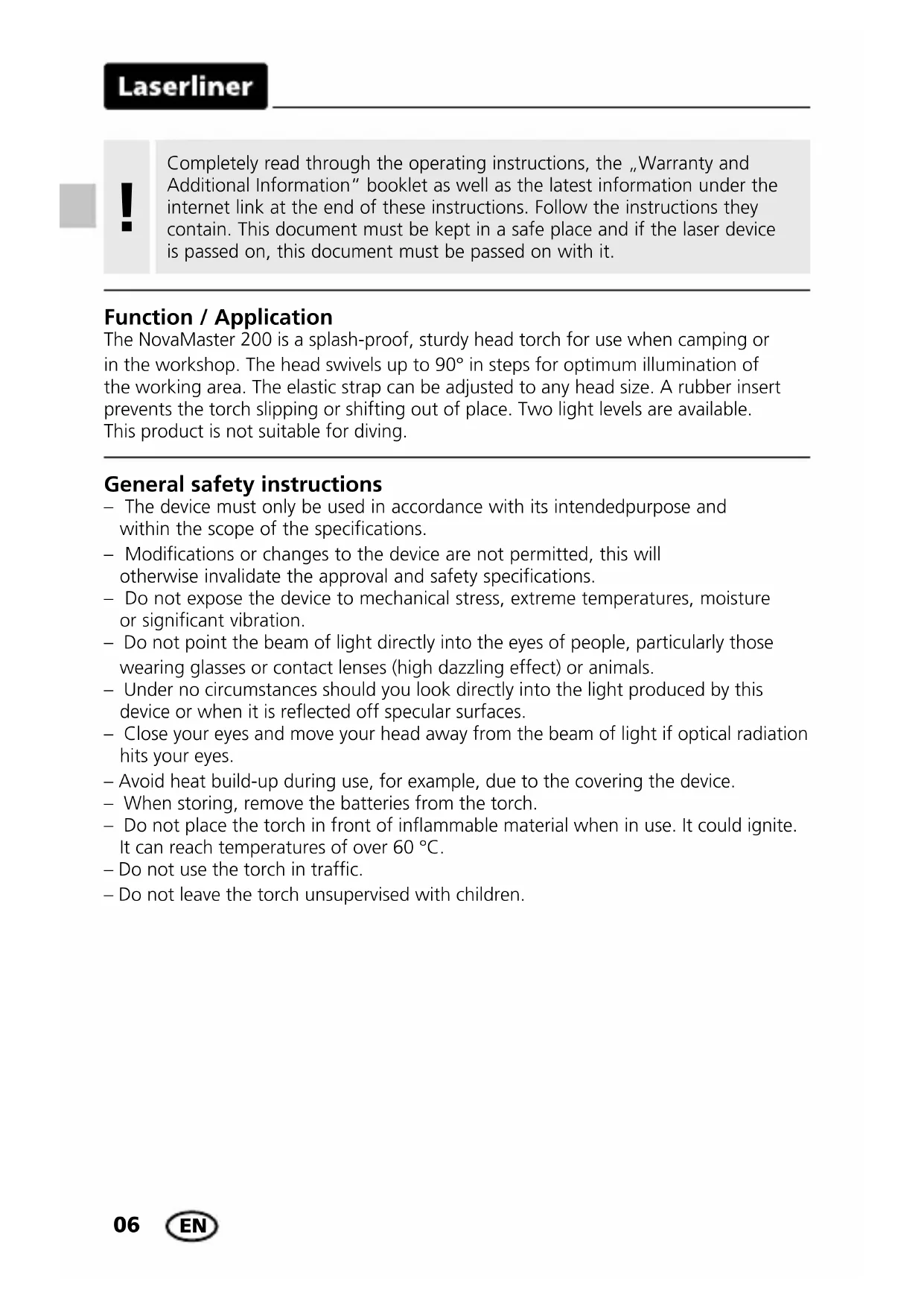 General safety instructions – The device must only be used in accordance with its intendedpurpose and within the scope of the specifications. – Modifications or changes to the device are not permitted, this will otherwise invalidate the approval and safety specifications. – Do not expose the device to mechanical stress, extreme temperatures, moisture or significant vibration. – Do not point the beam of light directly into the eyes of people, particularly those wearing glasses or contact lenses (high dazzling effect) or animals. – Under no circumstances should you look directly into the light produced by this device or when it is reected off specular surfaces. – Close your eyes and move your head away from the beam of light if optical radiation hits your eyes. – Avoid heat build-up during use, for example, due to the covering the device. – When storing, remove the batteries from the torch. – Do not place the torch in front of inammable material when in use. It could ignite. It can reach temperatures of over 60 °C. – Do not use the torch in trafc. – Do not leave the torch unsupervised with children. Function / Application The NovaMaster 200 is a splash-proof, sturdy head torch for use when camping or in the workshop. The head swivels up to 90° in steps for optimum illumination of the working area. The elastic strap can be adjusted to any head size. A rubber insert prevents the torch slipping or shifting out of place. Two light levels are available. This product is not suitable for diving. Completely read through the operating instructions, the „Warranty and Additional Information“ booklet as well as the latest information under the internet link at the end of these instructions. Follow the instructions they contain. This document must be kept in a safe place and if the laser device is passed on, this document must be passed on with it. !07 NovaMaster 200