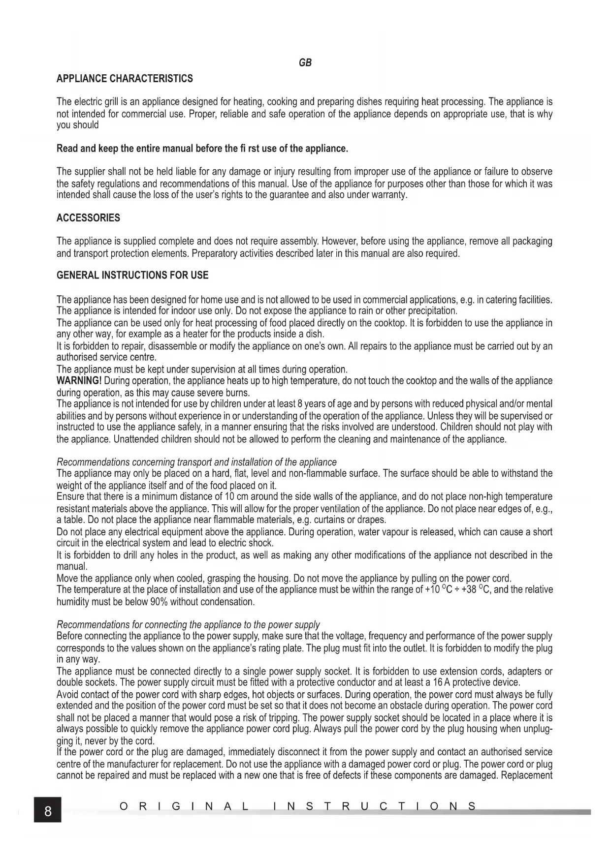 ORIGINAL INSTRUCTIONS APPLIANCE CHARACTERISTICS The electric grill is an appliance designed for heating, cooking and preparing dishes requiring heat processing. The appliance is not intended for commercial use. Proper, reliable and safe operation of the appliance depends on appropriate use, that is why you should Read and keep the entire manual before the fi rst use of the appliance. The supplier shall not be held liable for any damage or injury resulting from improper use of the appliance or failure to observe the safety regulations and recommendations of this manual. Use of the appliance for purposes other than those for which it was intended shall cause the loss of the user’s rights to the guarantee and also under warranty. ACCESSORIES The appliance is supplied complete and does not require assembly. However, before using the appliance, remove all packaging and transport protection elements. Preparatory activities described later in this manual are also required.