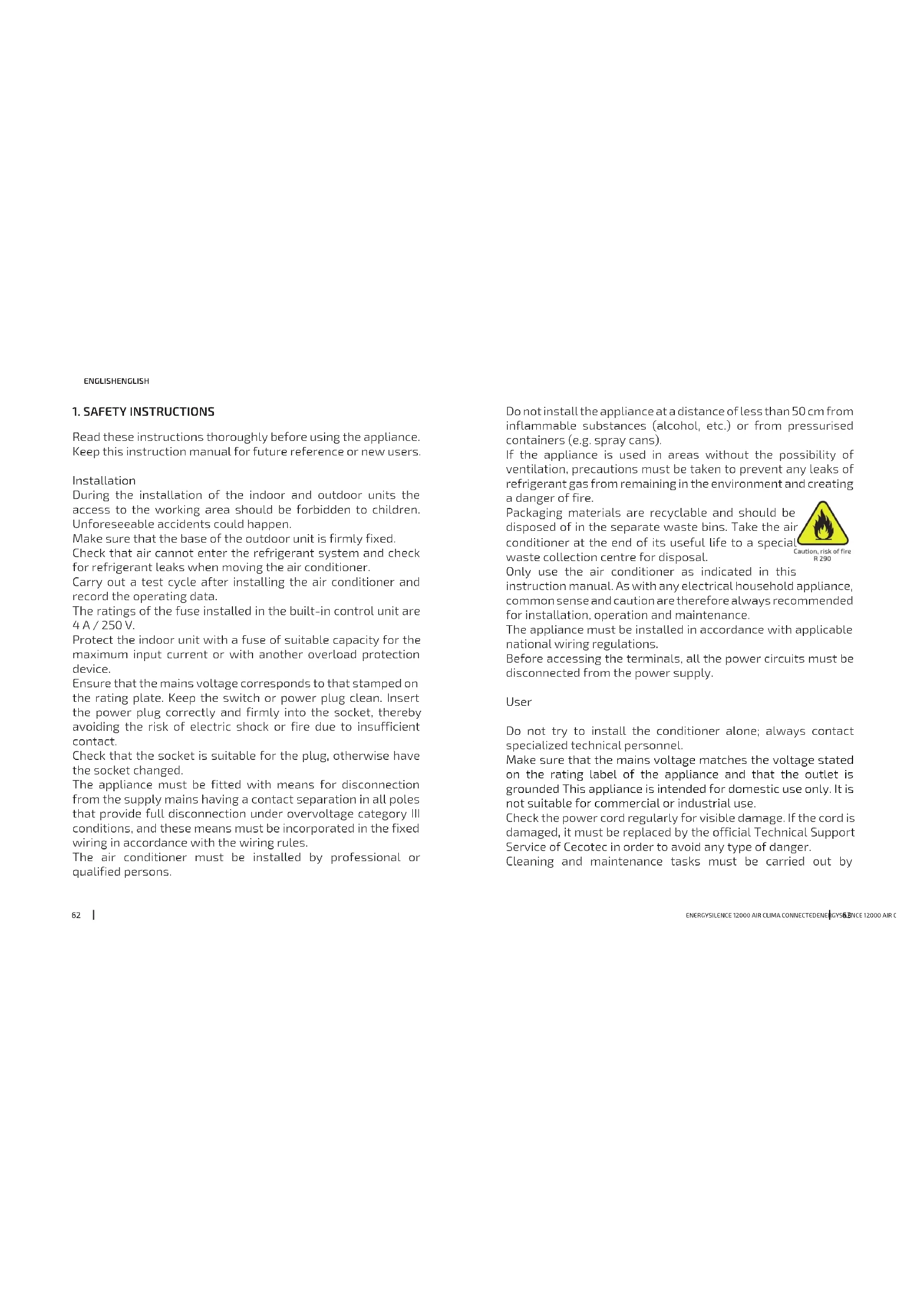 Read these instructions thoroughly before using the appliance. Keep this instruction manual for future reference or new users. Installation During the installation of the indoor and outdoor units the access to the working area should be forbidden to children. Unforeseeable accidents could happen. Make sure that the base of the outdoor unit is firmly fixed. Check that air cannot enter the refrigerant system and check for refrigerant leaks when moving the air conditioner. Carry out a test cycle after installing the air conditioner and record the operating data. The ratings of the fuse installed in the built-in control unit are 4 A / 250 V. Protect the indoor unit with a fuse of suitable capacity for the maximum input current or with another overload protection device. Ensure that the mains voltage corresponds to that stamped on the rating plate. Keep the switch or power plug clean. Insert the power plug correctly and firmly into the socket, thereby avoiding the risk of electric shock or fire due to insufficient contact. Check that the socket is suitable for the plug, otherwise have the socket changed. The appliance must be fitted with means for disconnection from the supply mains having a contact separation in all poles that provide full disconnection under overvoltage category III conditions, and these means must be incorporated in the fixed wiring in accordance with the wiring rules. The air conditioner must be installed by professional or qualified persons. Do not install the appliance at a distance of less than 50 cm from inflammable substances (alcohol, etc.) or from pressurised containers (e.g. spray cans). If the appliance is used in areas without the possibility of ventilation, precautions must be taken to prevent any leaks of refrigerant gas from remaining in the environment and creating a danger of fire. Packaging materials are recyclable and should be disposed of in the separate waste bins. Take the air conditioner at the end of its useful life to a special waste collection centre for disposal. Only use the air conditioner as indicated in this instruction manual. As with any electrical household appliance, common sense and caution are therefore always recommended for installation, operation and maintenance. The appliance must be installed in accordance with applicable national wiring regulations. Before accessing the terminals, all the power circuits must be disconnected from the power supply. User Do not try to install the conditioner alone; always contact specialized technical personnel. Make sure that the mains voltage matches the voltage stated on the rating label of the appliance and that the outlet is grounded This appliance is intended for domestic use only. It is not suitable for commercial or industrial use. Check the power cord regularly for visible damage. If the cord is damaged, it must be replaced by the official Technical Support Service of Cecotec in order to avoid any type of danger. Cleaning and maintenance tasks must be carried out byENERGYSILENCE 12000 AIR CLIMA CONNECTEDENERGYSILENCE 12000 AIR CLIMA CONNECTED